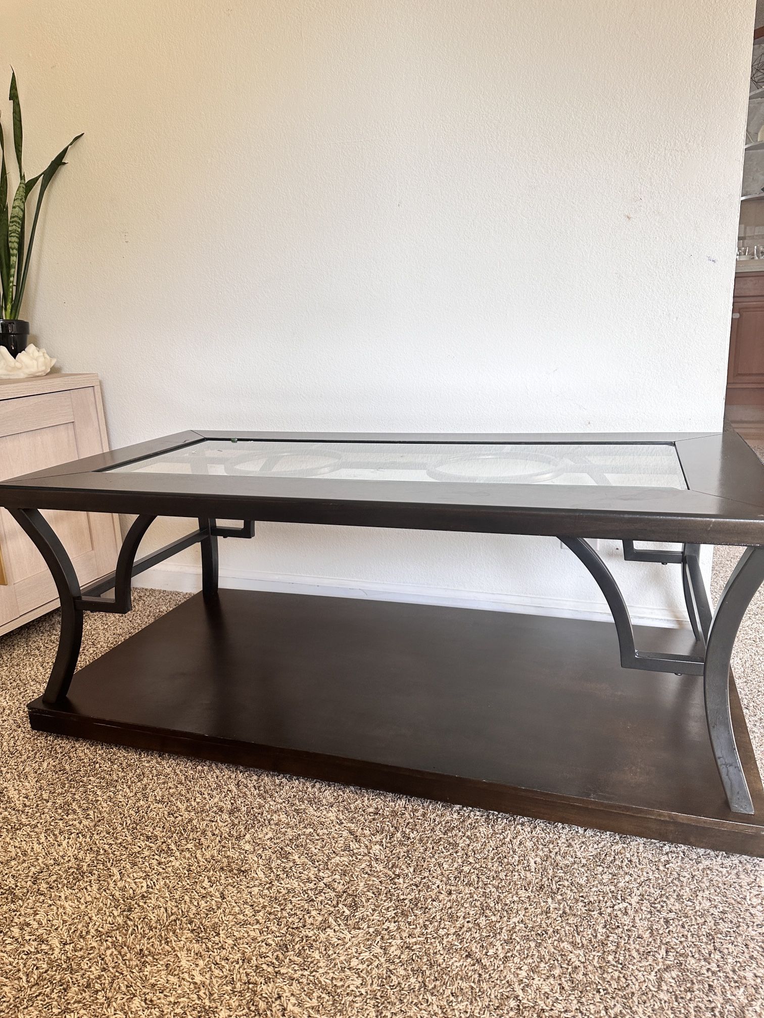 Coffee table with wheels and side tables with glass top dark brown, solid wood in excellent condition Coffee table $150 Side table $80each Coffee table 24"D x 48"W x 18"H side tables 24"D x 24"W x 24"H