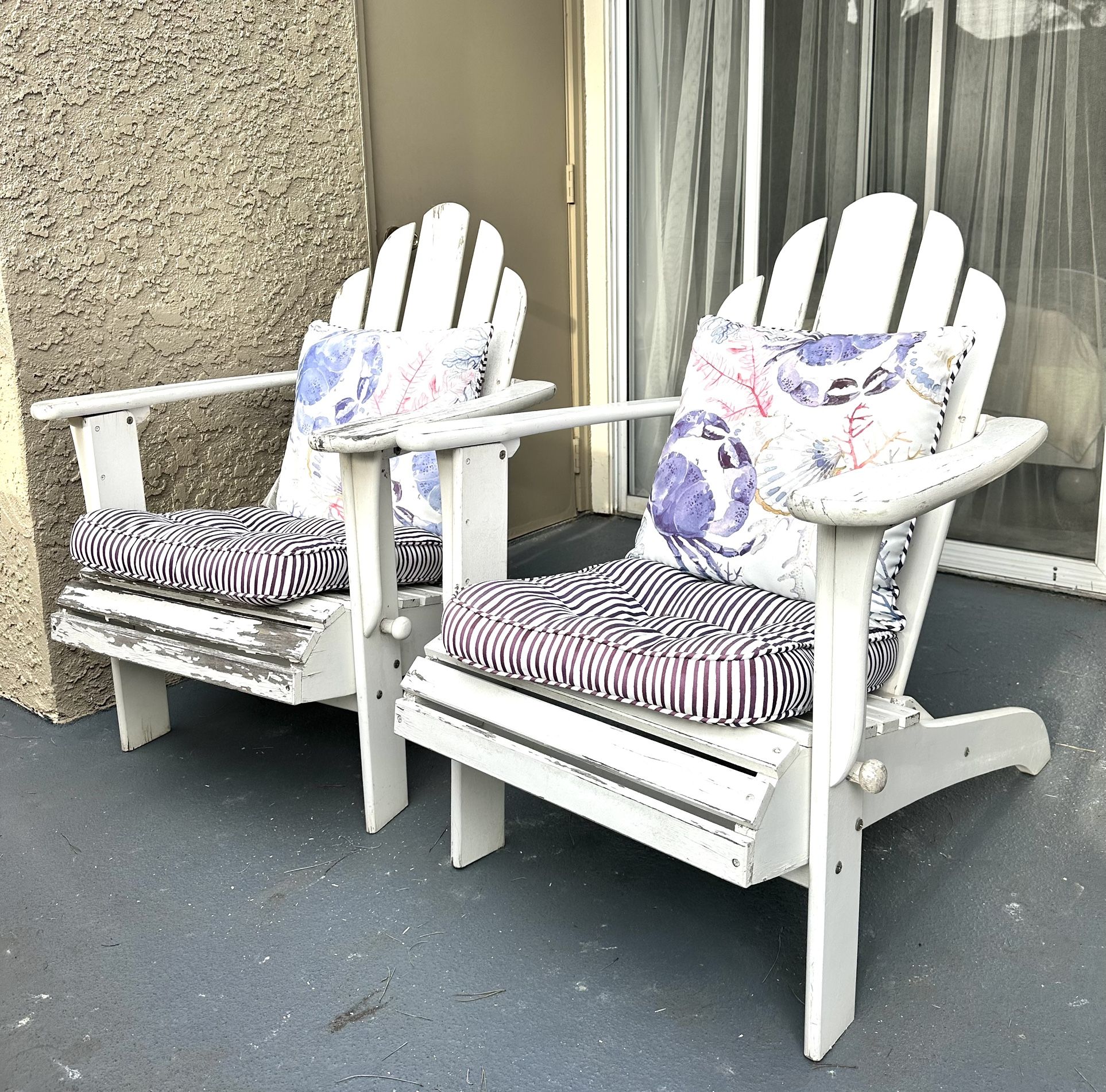 Wooden Adirondack chairs, perfect for a balcony, patio, or small outdoor space. Solid and comfortable. Includes seat & back cushions. Good condition, no broken, just needs fresh paint.