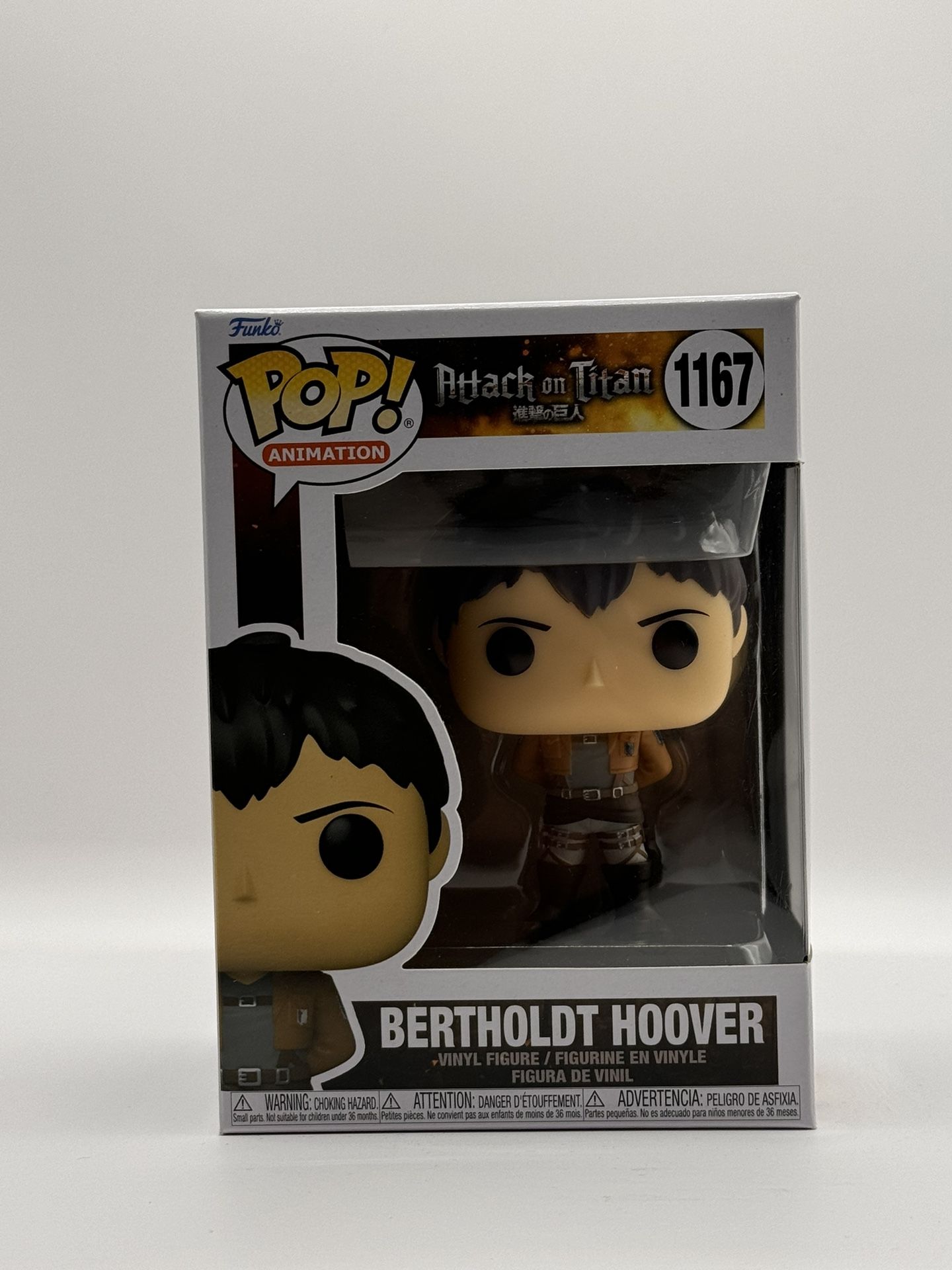 Pop! Bertholdt Hoover is standing at ease in his scout uniform, waiting to start the next mission in your Attack on Titan collection; Be careful of Hoover's unusual Titan form unleashing chaos upon the collection