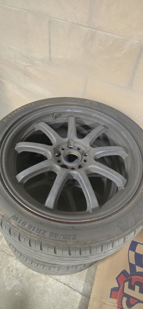 I have a set of gramlight 57Optimise 18x7.5 for sale. Wheels aren't perfect with 1 rim that has a slight bent lip. No other damages to wheels. Originally time attack version but previous owner sprayed them flat black. Perfect for rollers or daily driving. Tires are at about 90% tread Kumho ecsta ps31 225 45 18
