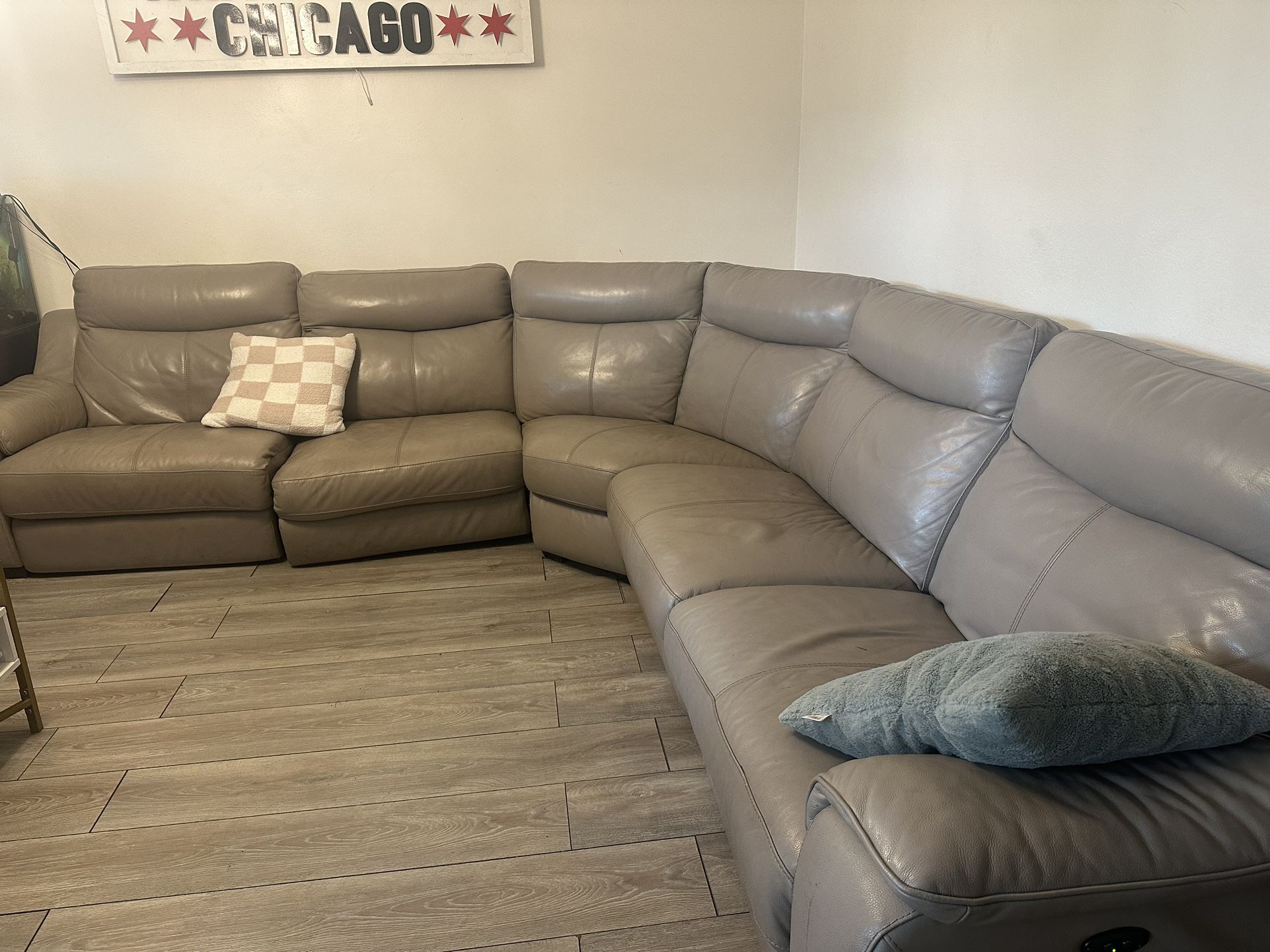 Lightlys used leather sectional couch 2 electric recliners. Perfect for sports fan or movie watchers, 125"W 112"D