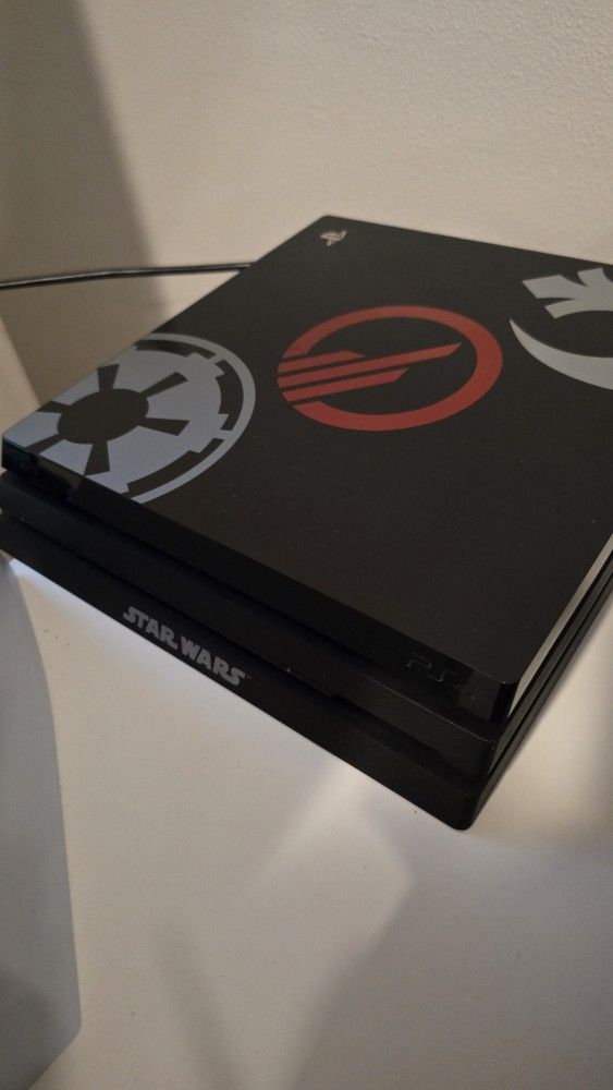 Starwars edition ps4, I have replaced the thermal paste, and cleaned the inside myself, so she runs quiet. Comes with two controllers, both in decent condition, will need to be fixed for controller drift, and the starwars edition one will need an extra repair for the light. Both charge and are usable. Will come fully reset. Comes with; Two controllers, Console, Power cord, HDMI cord, PICK UP ONLY can meet local on a nice day. NO TRADES NO LOW BALL OFFERS