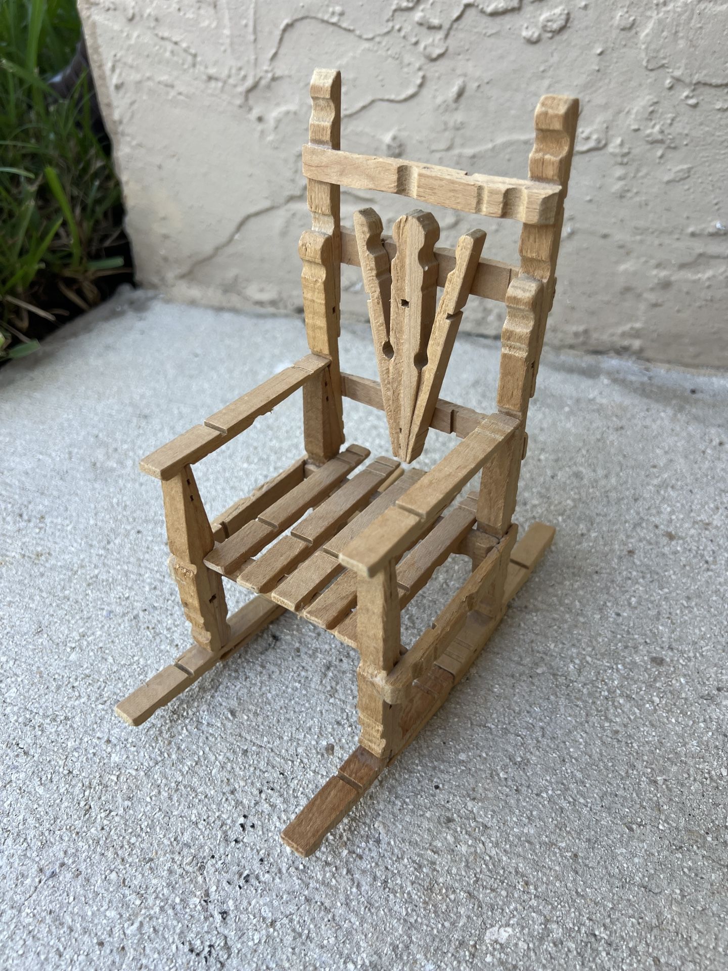 Hand Made, the chair is made from a clothespin. Dimensions: 8.5 by 7.5 inches.