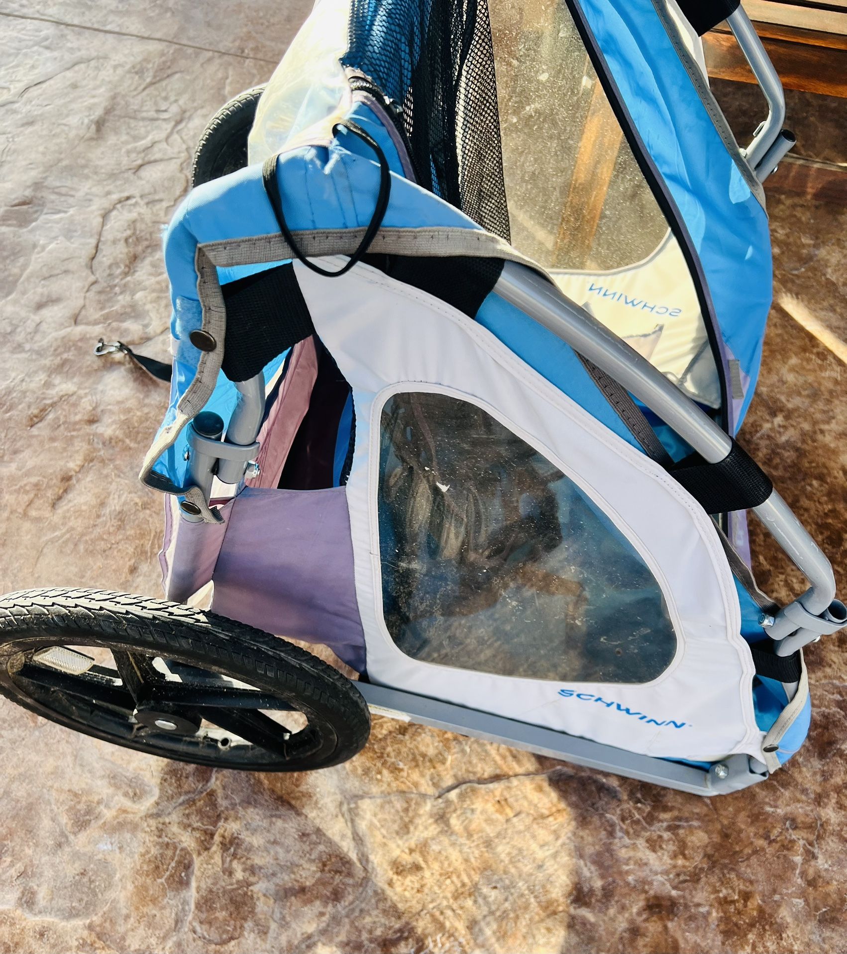 Blue schwinn bike trailer. Perfect for kids and dogs, my toddler barely used it. Great condition. NW area Pick only