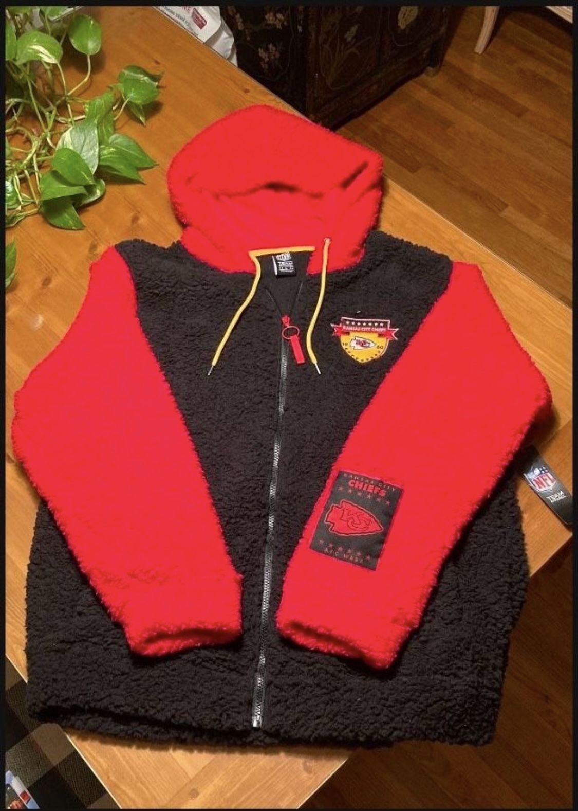 Kansas City Chiefs- Long Sleeve Zipper Fleece Hoodie- Official NFL Apparel- Size Adult Large. Has 2 Emblems on it! ***NEW*** Still has tag on it! Excellent Condition! *CLEAN* **NEW** Very Nice-Red/Gold/Black colored- Nice and warm, soft fleece zippered Hoodie!! **NEW** $95.00 Excellent Condition! Non Smoking Home. New with Original Tags on it. $95.00 Price Reduced to: $60.00