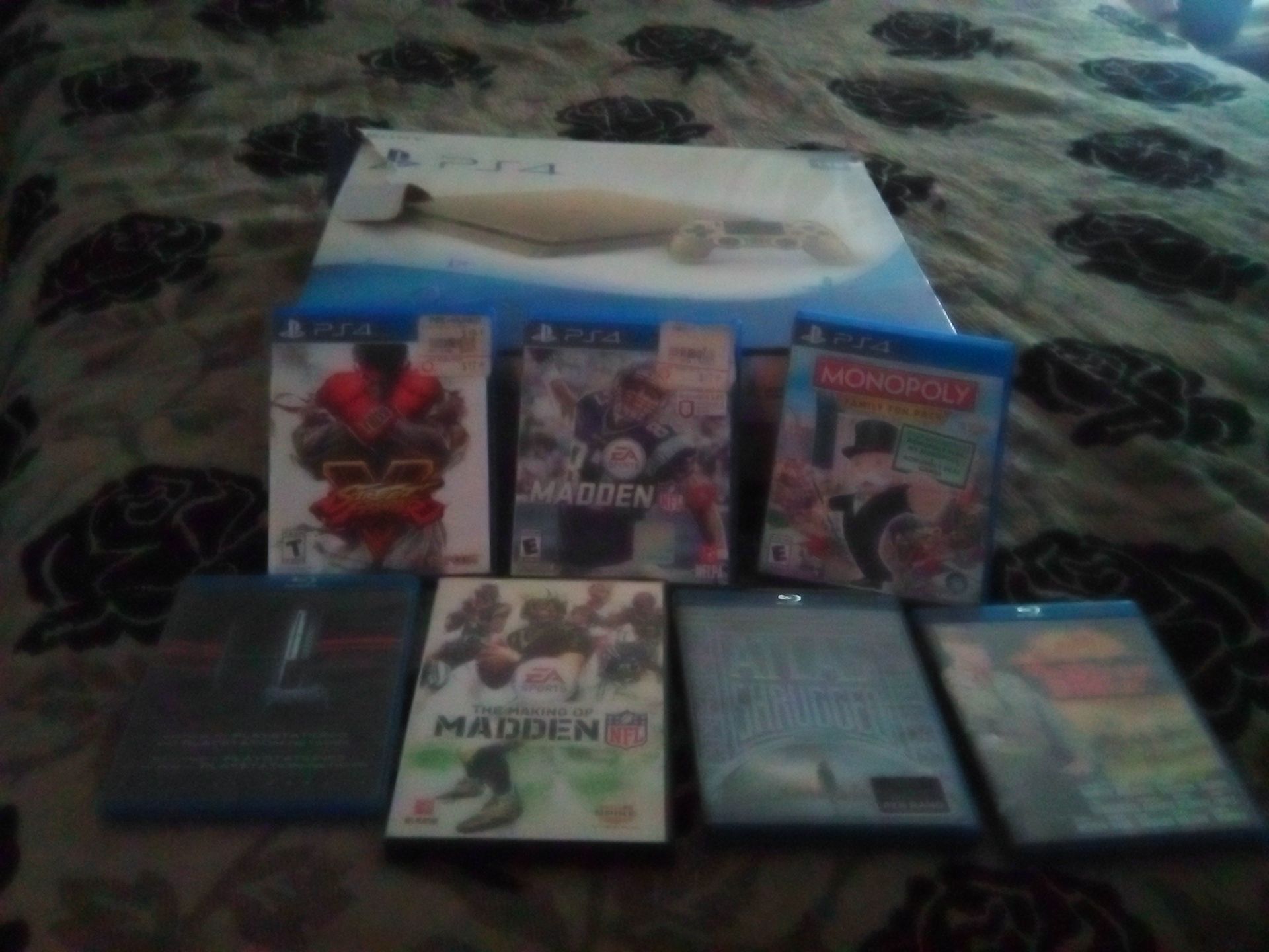 Top of the line, 1TB GOLD PS4 w/1 original Gold Controller, 3 Games (Street Fighter V/Madden 17/Monopoly), 3 Blue Ray Movies (The Dirty Dozen/Also Shrugged/The Making of Madden). Even though it's 9 years old, it's in PRISTINE, PERFECT LIKE NEW CONDITION.