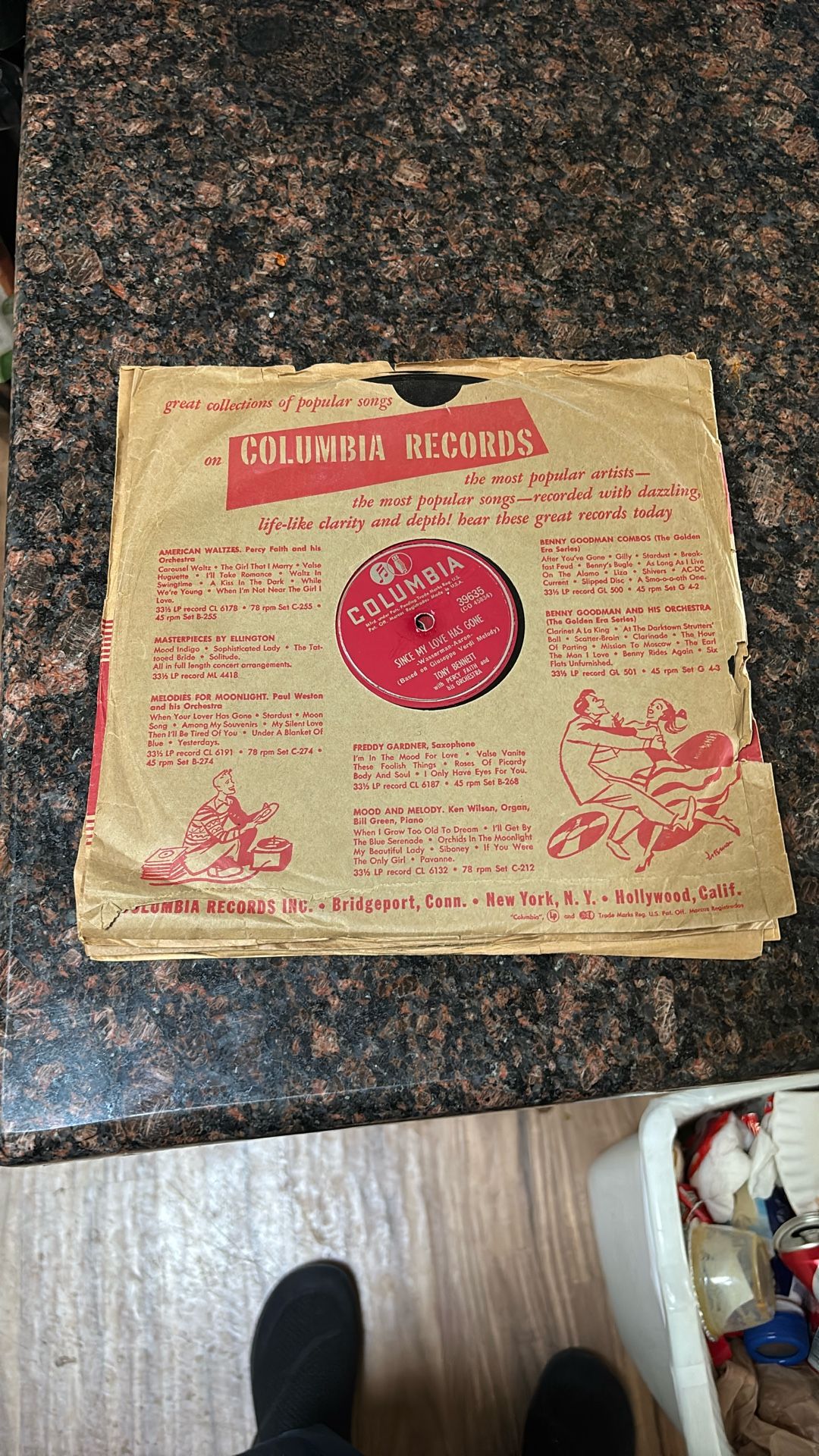 Vintage 1940’s hard Columbia record. Original sleeve. Some playable scratches, nothing major. See photos. Plays but sold as is worn and used.