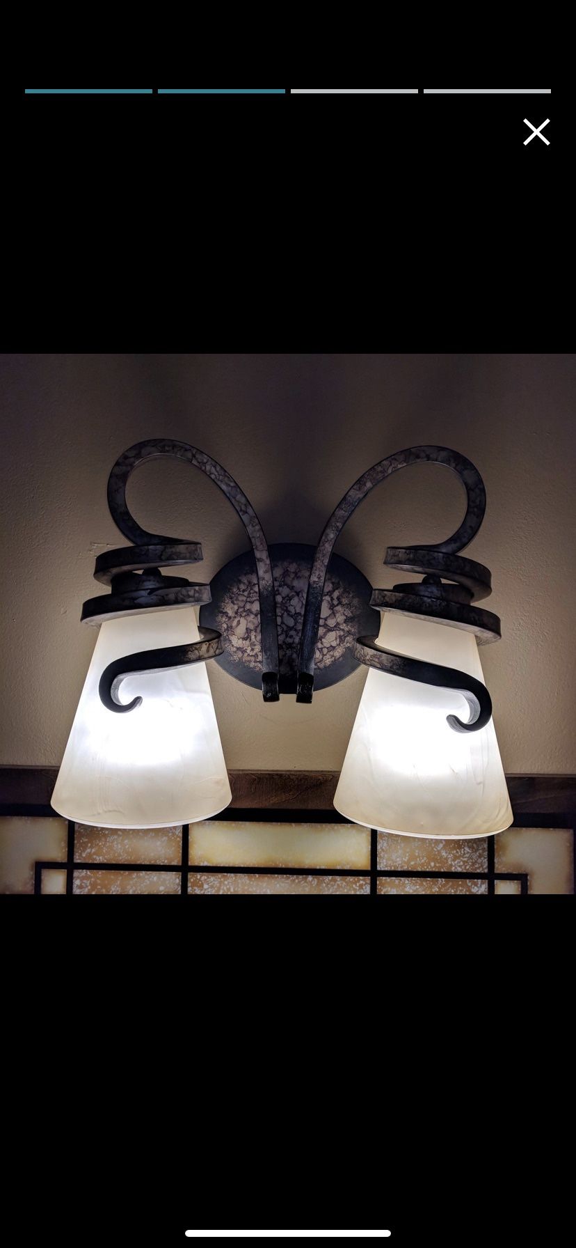 Never used or installed (pictures are for reference). Paid $200 and still sells new for $200. Local pickup please. AJ near Ironwood and superstition. VANITY LIGHT DIMENSIONS: 12.5" High x 14" Wide x 8" Deep, Weight: 8.82 lbs, Wall Plate Mount: 5.13" W MEDIUM BASE LIGHT SOCKET: 200 Max Wattage, (2) 100 Watt A19 Style Bulbs, Compatible with E26 Base, Case Use: LED, Fluorescent, Halogen or Incandescent Bulbs, Does Not Include Bulb(s), Dimming possible when used with Dimmable Bulb and Dimmer Switch INSTALLATION: Lights Up or Down Position(s). Includes 7" Long Wire and Comes with Hardware Mounting Kit Can be used in DAMP Locations, Approved by Underwrites Laboratories (UL) FINISH: Tofino Bronze with Marbre Graber Glass Bulbs are not included with this fixture Traditional styling makes this fixture a perfect showpiece for any home The double coating of Dark Brushed Bronze finish ensures your fixture will stay true to design for years to come Utilizes A19 MED bulbs Spumante Lace Glass shades included