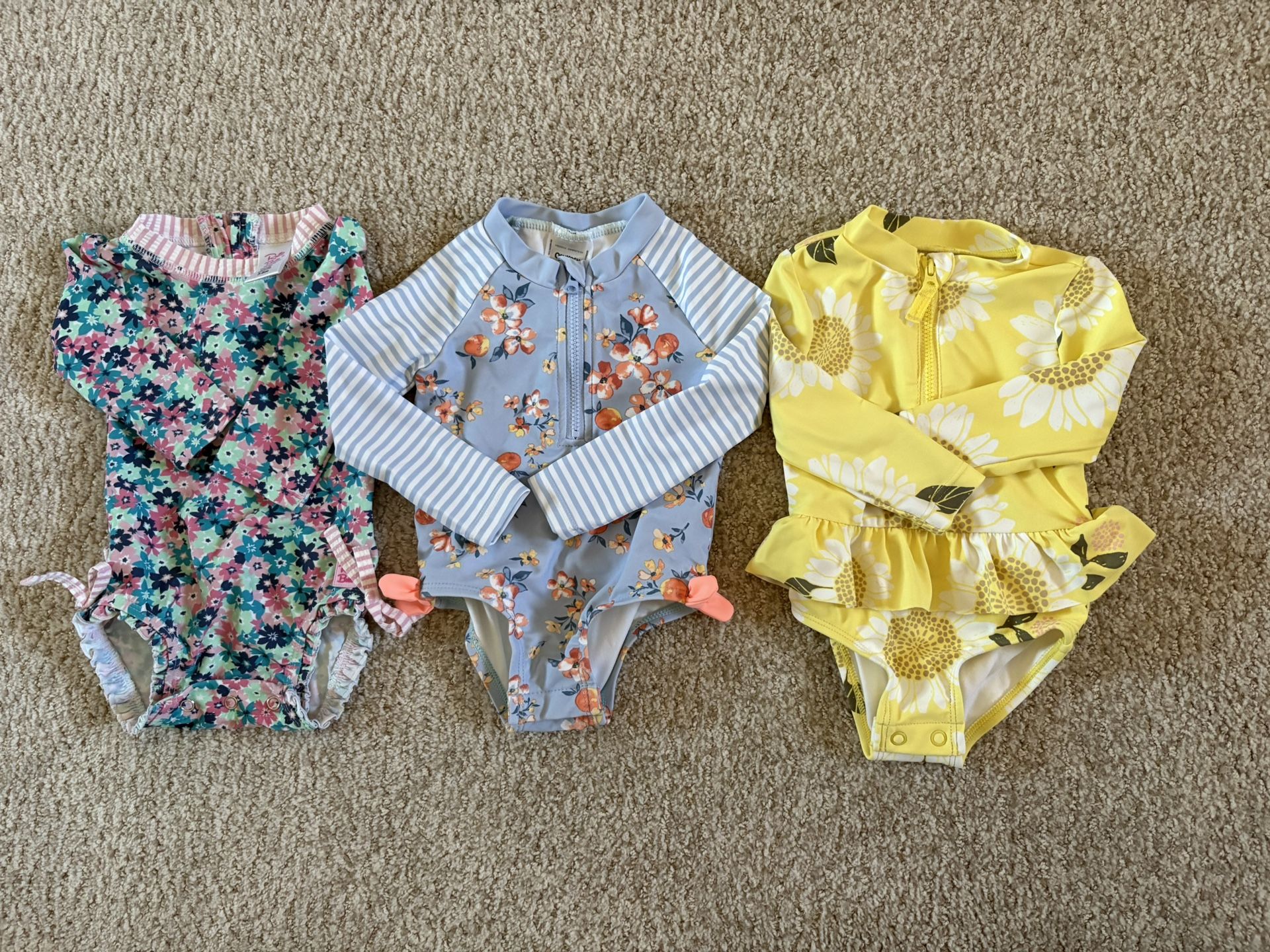 Perfect summer style with thee three super adorable swimsuits! Bundle includes (from L to R) 3-6m Ruffle butts floral swimsuit, 6m OshKosh B’gosh blue floral/stripe swimsuit, and 6m Carter’s yellow sunflower bathing suit. All swimsuits are in great condition!