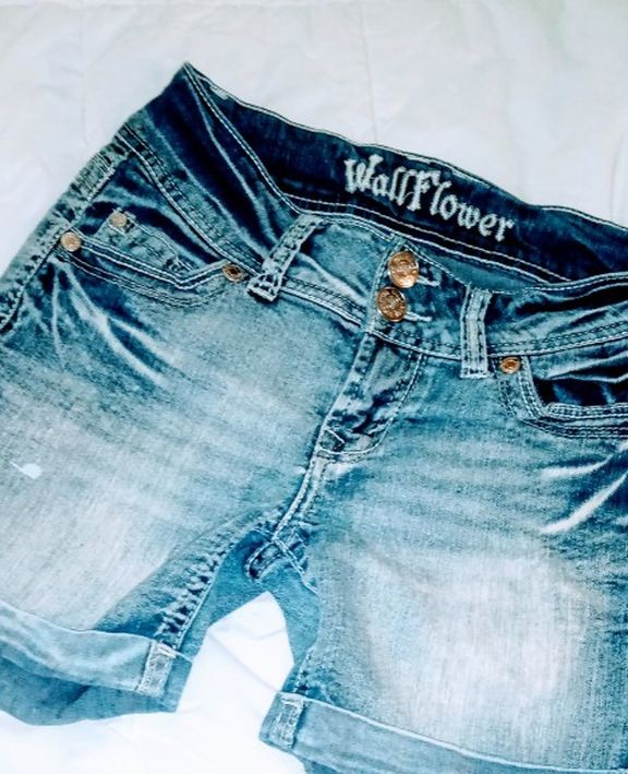 ° Wallflower Cuffed Jean Shorts ° Size: 1 ° Materials: 62% ramie, 20% cotton, 17% polyester & 1% Spandex ° Shade: Indigo Denim ° shorts have 2 open front pockets with 1 small front pocket, two back pockets with button closures & 2 buttons and a zipper closure ° like new condition