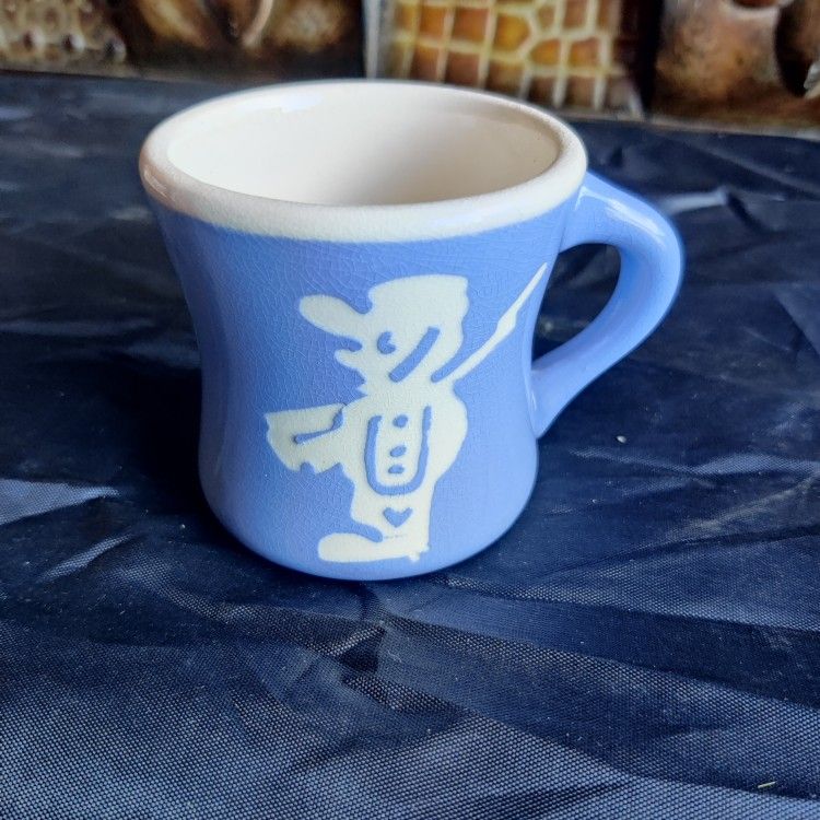 HARKER POTTERY CO. CAMEO WARE BLUE & WHITE SOLDIER and ELEPHANT CHILD'S Mug, 1940's-1950's. Mug measures 3" High. There is natural crazing through out as expected for age. Very nice Harker Pottery Co cameo ware child's mug. The blue set features a white soldier and elephant on the mug. Porch pickup. (CHILDDISH).
