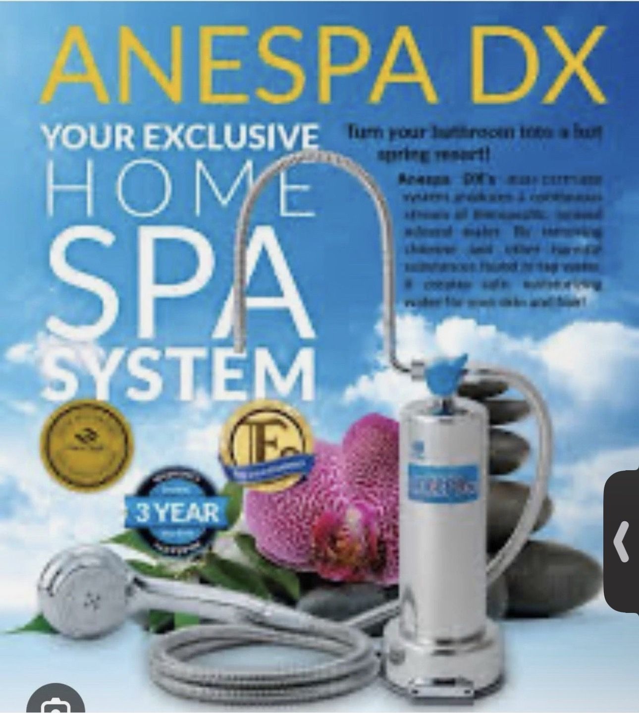 Treat yourself to a soothing hot spring experience with the ANESPA DX! With an abundant flow of mineralized water and a relaxing massage shower head, your bathroom can instantly turn into a calming hot spring oasis. Generates: Mineral ion water for your bath or shower. The cartridge purification system effectively removes chlorine and bacteria, leaving you with a fresh, invigorating feeling. Protect your delicate skin from the harmful effects of tap water. Active charcoal filter Futama-ceramic inner filter. ANESPA DX produces a continuous stream of healthy ionized mineral water. With a new, larger ceramic cartridge that removes almost 100% of chlorine and other harmful substances in your tap water, and adds safe, moisturizing minerals that are healthy for your skin and hair. Enjoy a lovely shower or bath in ANESPA DX hot spring water! Never open box!!! I’m a direct distributor for this high quality product.