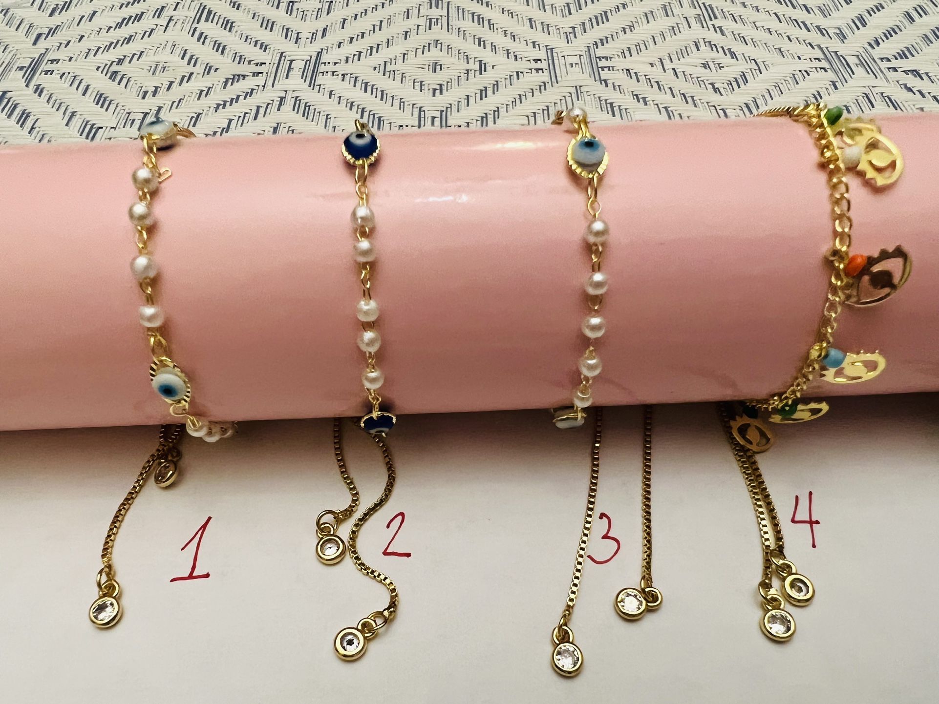 Evil eye bracelet for women and girls. This is adjustable gold plated. Please select the number on the picture for the design desired. Available for pick up at lake worth area.