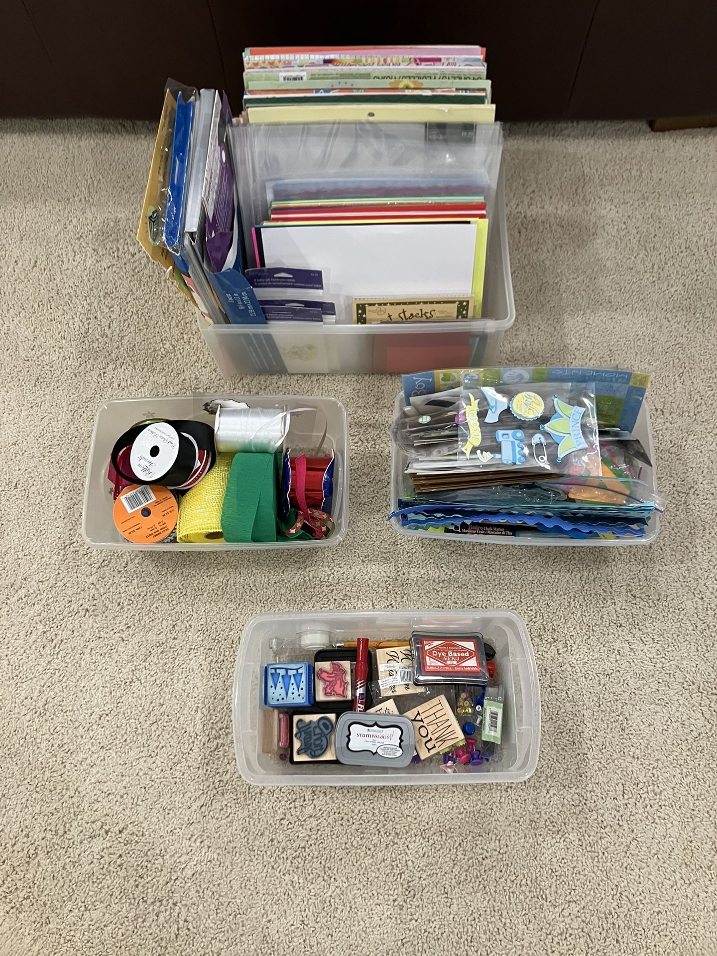 4 boxes filled with a large supply of miscellaneous crafting items, including Paper, Decals, Stamps w/ink, Ribbons and Plastic Sleeves.