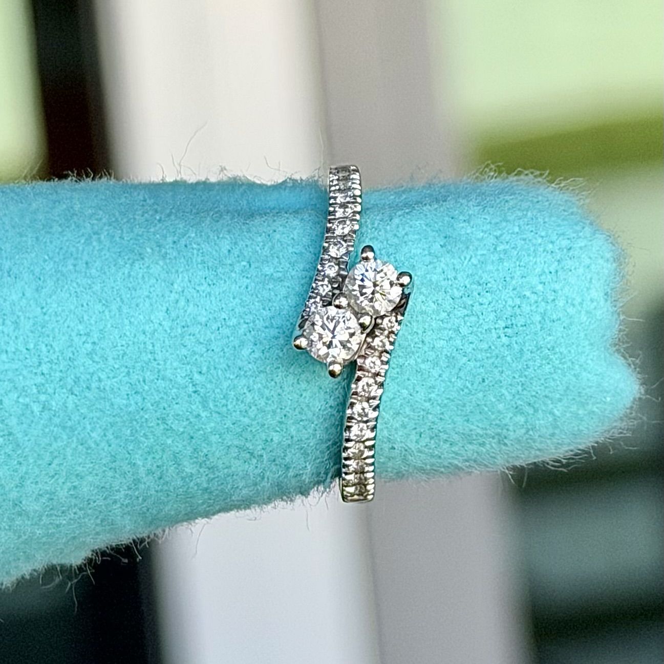 Open to reasonable offers!! :) Zales 14K White Gold Ever Us Diamond Duo Bypass Engagement Promise Bridal Ring - Ring Size: 6.5 Total estimated center weight: Likely around 1.30 carats combined. They are well-matched in size and color. Pavé-set diamonds run along both sides of the band. These are likely small melee diamonds totaling around 0.15–0.30 carats combined (estimate). Bypass / Split look – The band curves around the stones rather than being straight, giving it a flowing, contemporary feel.