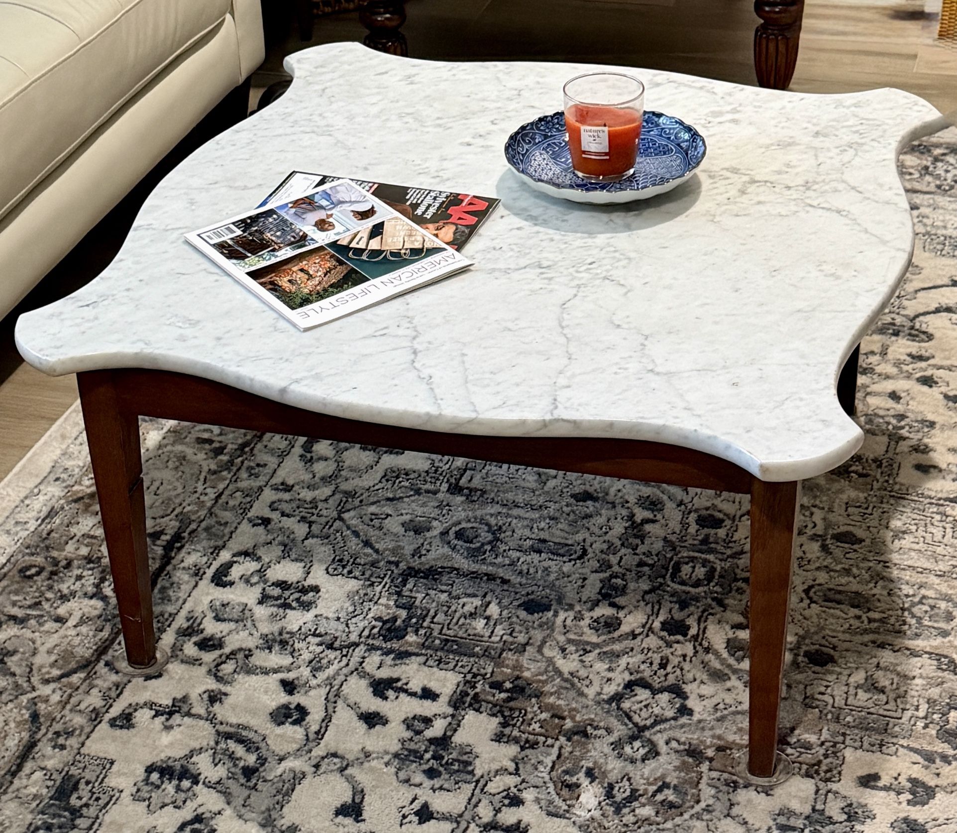 This beautiful vintage white marble top coffee table measures 34 x 34 x 17. Marble top sits on a mahogany straight legged base. In excellent condition just too big for my room. Top is extremely heavy please bring help to move it Located near Central Avenue and Northern in Phoenix 85020.