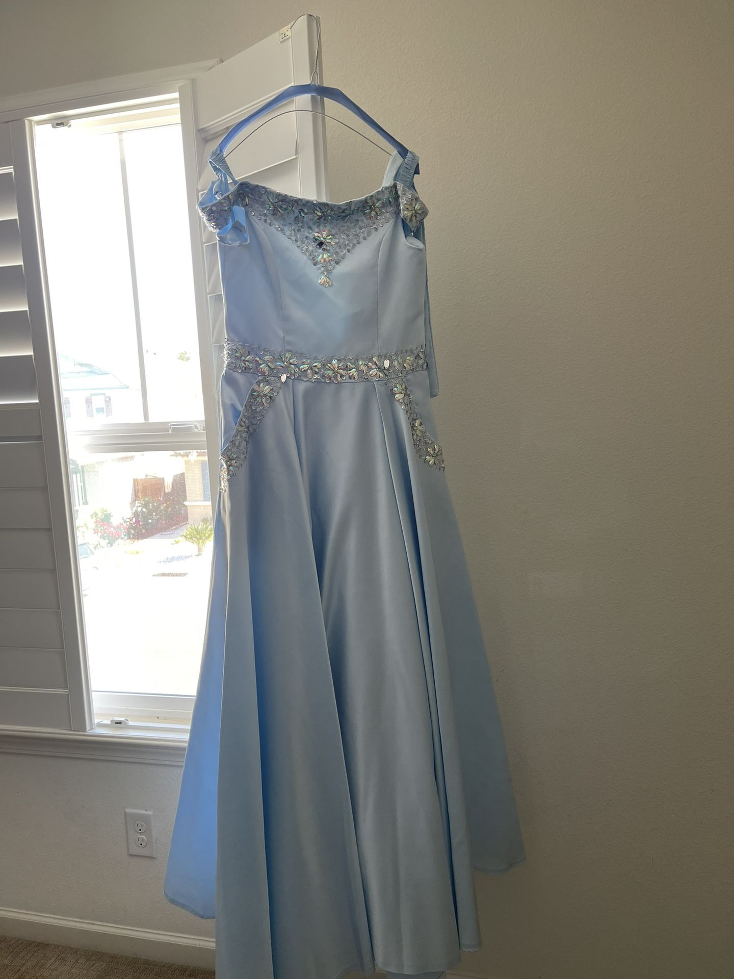 I have a full length, off the shoulder, light blue dress (with pockets) in a size 16. It has been worn, but is in excellent shape and clean.