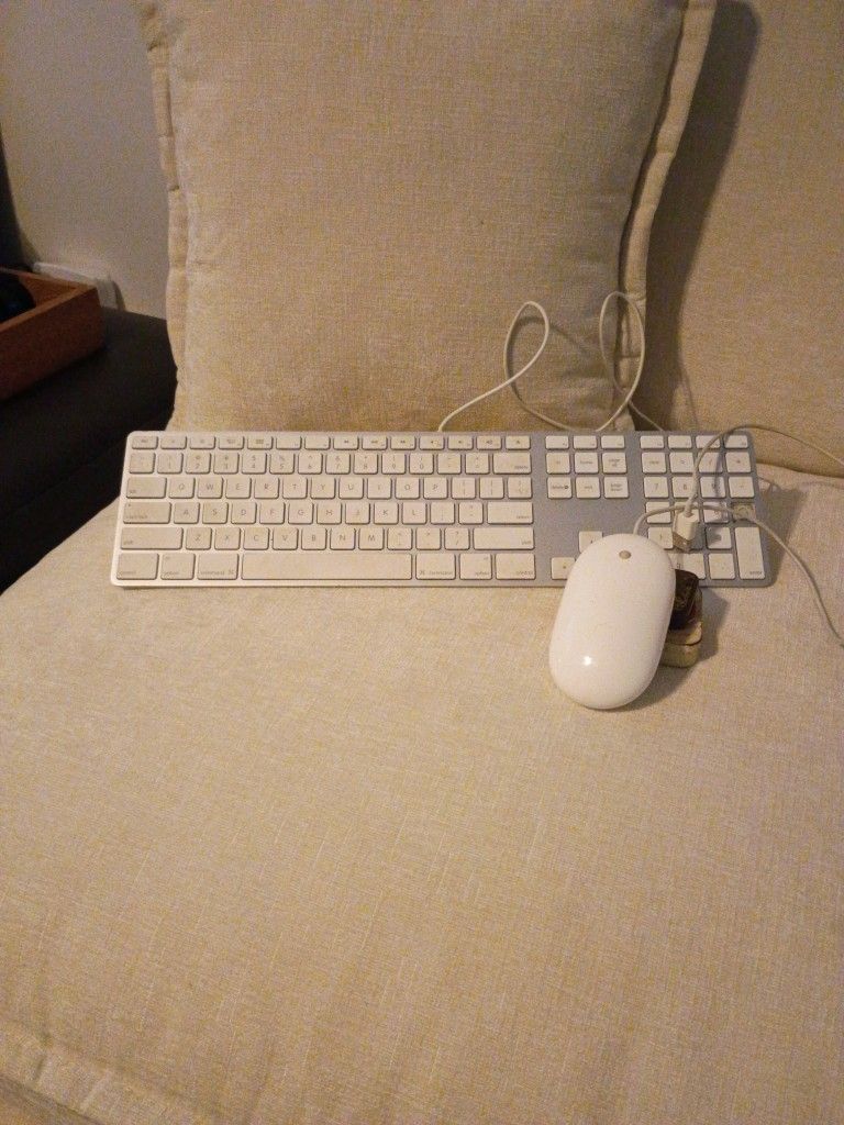 This is an Apple Keyboard with Numeric Keypad (Model MB110LL/A), shown alongside a wired Apple Mighty Mouse. The keyboard features an ultrathin anodized aluminum enclosure and low-profile keys. It includes an extended layout with a numeric keypad, document navigation controls, and full-size arrow keys. Two built-in USB 2.0 ports on the keyboard act as a hub for connecting peripherals like the mouse or a digital camera. This model was the last wired keyboard produced by Apple.