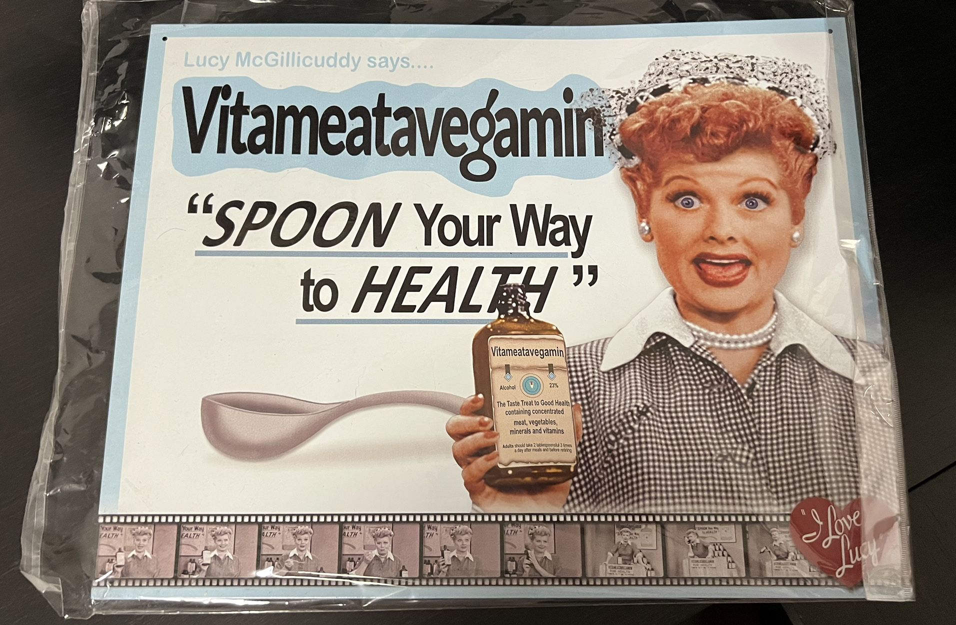 “I love Lucy” tin from the famous vitmeatavegamin episode. New. Plastic cover is torn but the tin has never been removed from it. It’s been in my closet for years. 16”x 13”