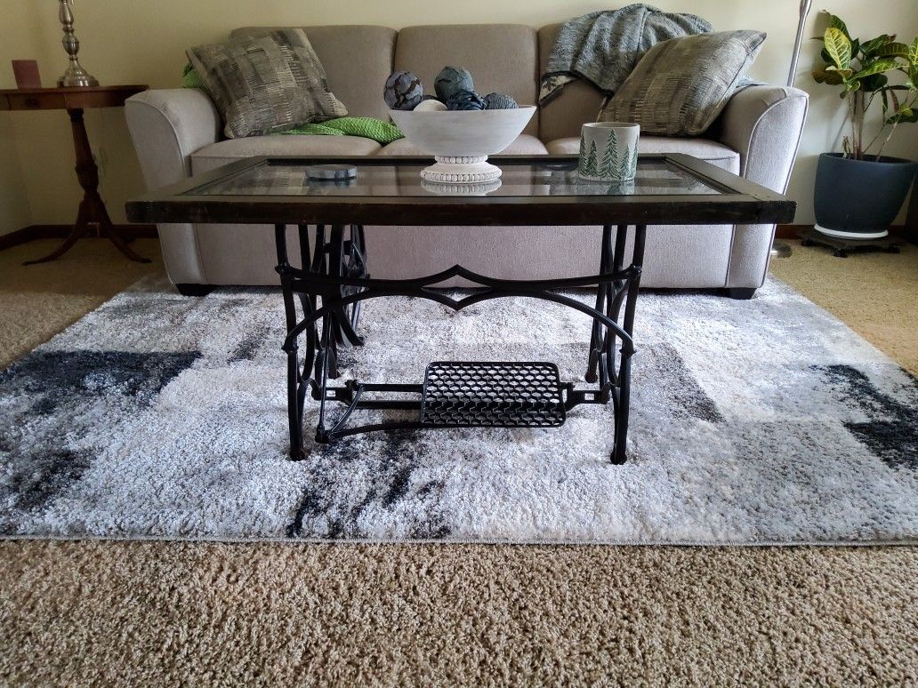 Beautiful hand crafted table top using vintage window wood & glass, repurposed sewing machine base stained a black to match. Selling only the table. Thank You for looking. H 21" x L 40" x W 25"