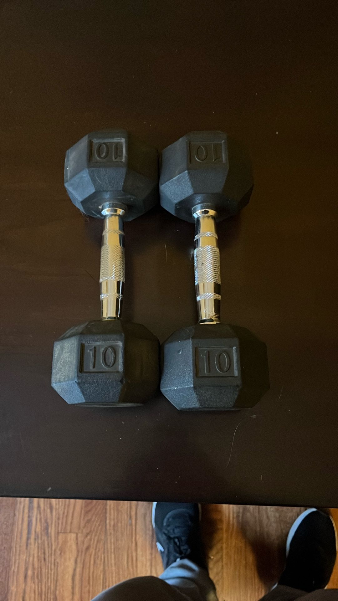 Pair of 10 lb hex dumbbells (20 lbs total). Rubber-coated hex design prevents rolling and protects floors. Solid metal handles with good grip. Light cosmetic wear from normal use, fully functional. Great for home workouts, toning, rehab, or beginners. Condition: Good Brand: Ignite Pickup: Local pickup only Cash or Zelle