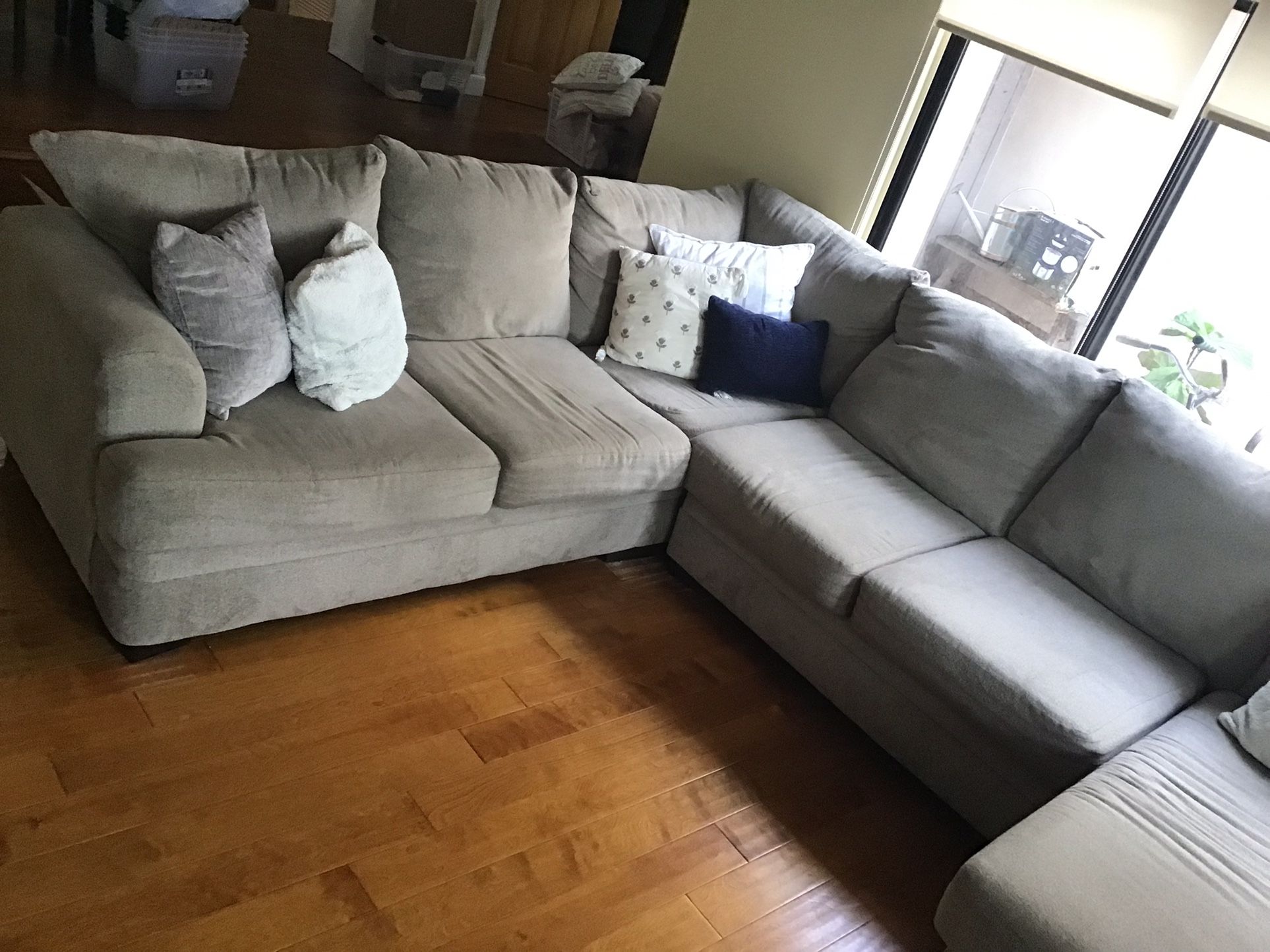 Extremely Comfortable Sectional Sofa With Chaise Built In And Ottoman Great condition one of the most comfortable sofas I have ever owned! Longer Sofa 102” length 40” depth Back of Sofa 36” tall and cushions 18” off of the floor Shorter part 92” length 40” depth and 64” depth for chaise Ottoman 48” length 26” width Thanks for looking!!! $825 Sofa and Ottoman