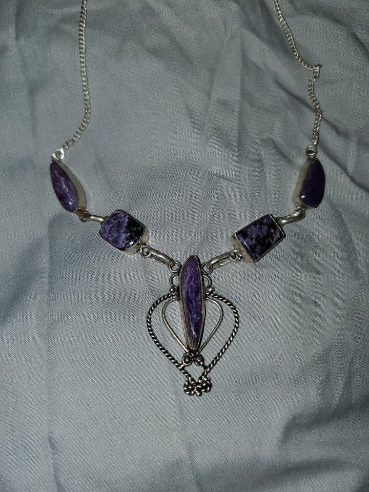 Beautiful handcrafted silver stamped necklace with genuine purple gemstone cabochons (charoite-style patterning) in mixed shapes. Eye‑catching center drop with detailed rope and knotwork design. Chain and setting are sturdy yet comfortable, great for special occasions or everyday boho wear.