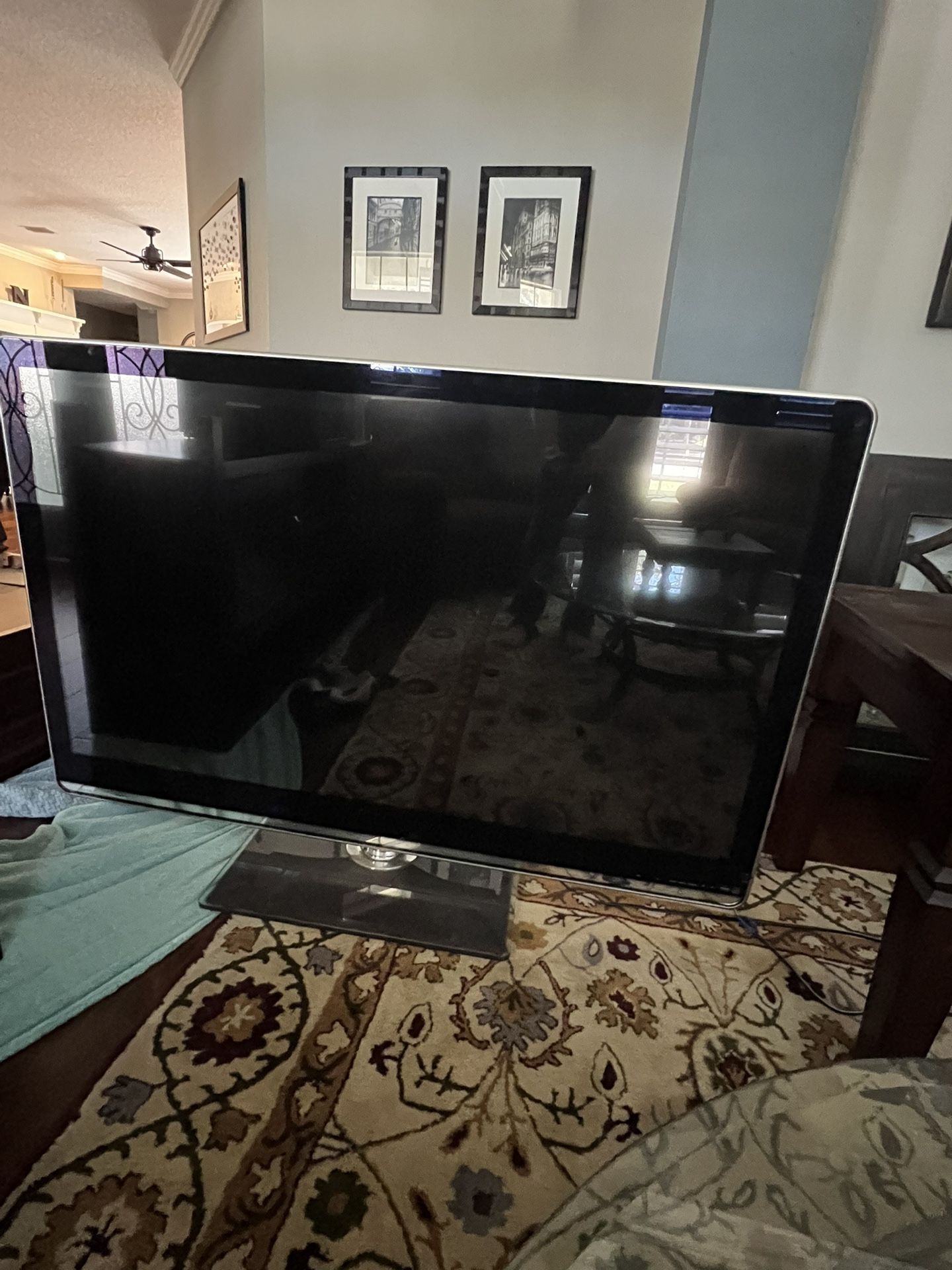 TV is in really great condition! Comes with remote and beautiful stand. Also have Onkyo amplifier, Belkin power console, subwoofer, a middle speaker and two front speakers if interested. Basically a whole home theater system.