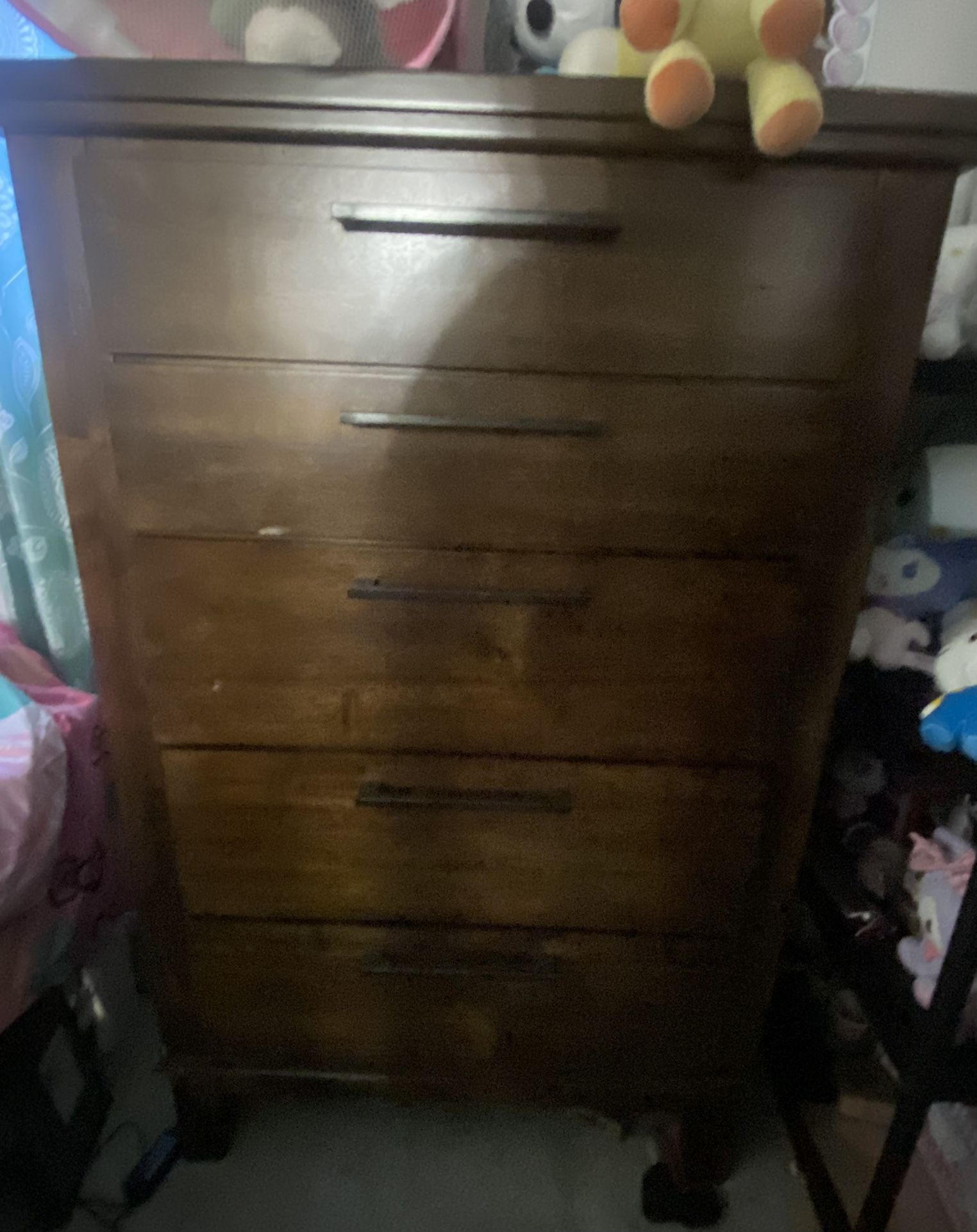 Selling a tall chest drawer brown color has a scratch on bottom left side but still in good condition selling as is . I have to much funiture and need this piece gone àsap . Im in second floor of apt building .