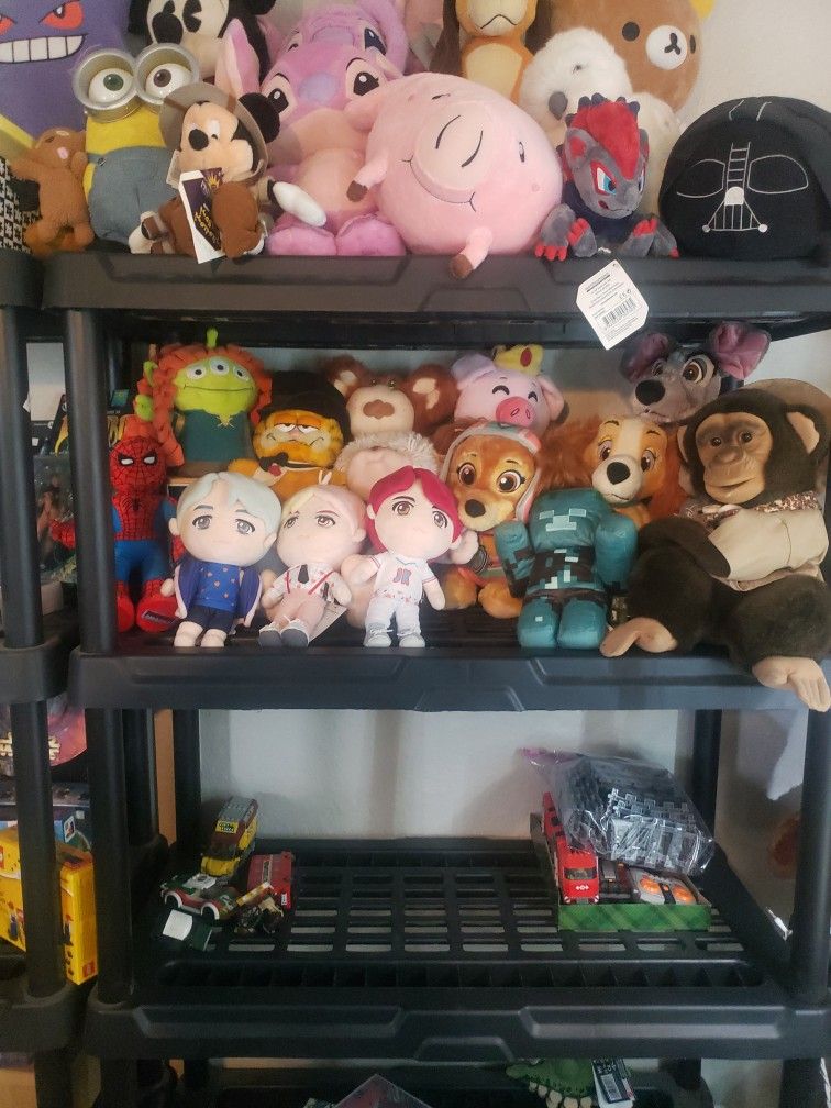 BTS-$100(for all three and 2 have tags, 1 does not) Spiderman with pull back mask-$20(has tags) Toy Story Alien Merida-$15(has tags) Garfield with top hat-$15(vintage) Cabbage Patch and Furskins-$20 each Liberty Build a Bear-$30(complete with helmet, collar, vest and backpack) Youtooz Technoblade-$15 Lady and the Tramp-$25(both have tags, selling together only) Drowned(Minecraft)$10 has tag Hosung Monkey Puppet-$25