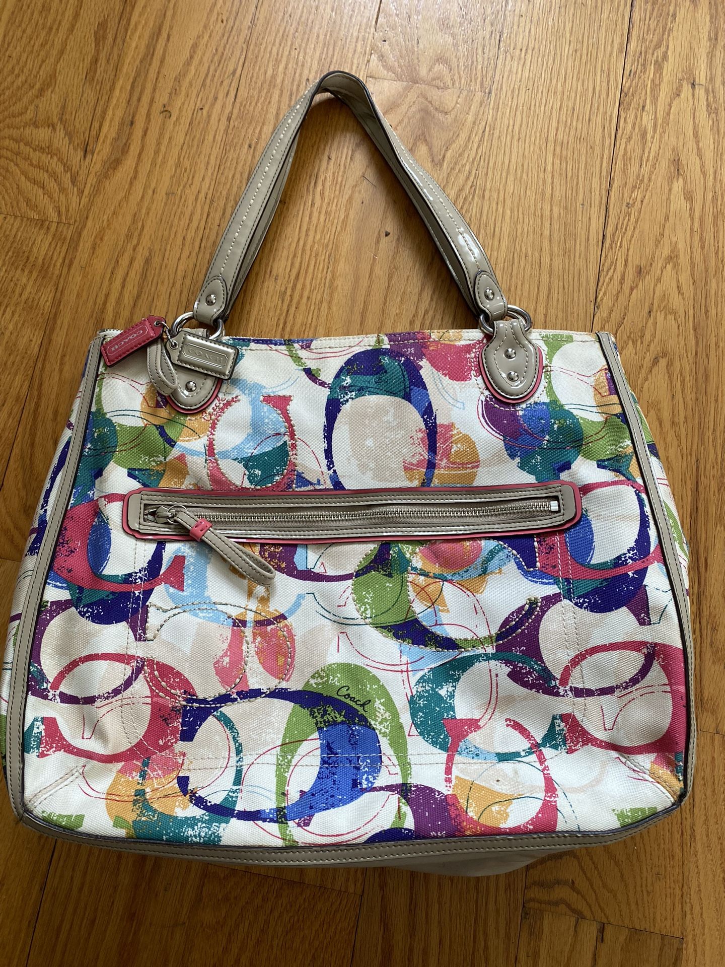 Authentic COACH handbag. Multicolored Poppy Style. Measures 16x14 (not including handles). Excellent condition. Used only a couple of times. Tiny bit of fraying on handle. see last picture No odors or stains. Inside is immaculate. Pick up in Groton.