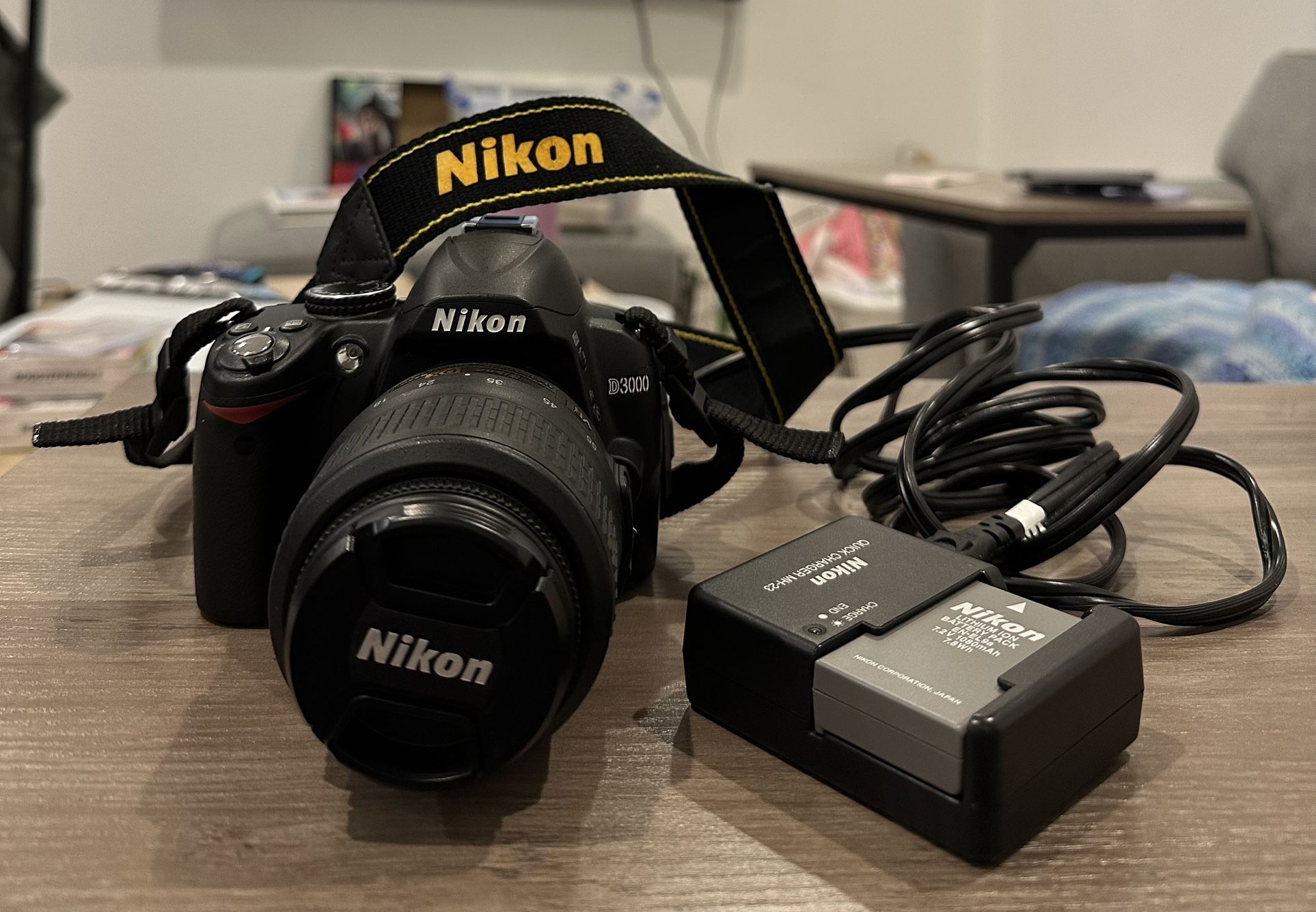 Selling a Nikon D3000 DSLR camera. This is known as a beginner friendly DSLR camera. It includes the original charger and camera case. I’m also throwing in a Zomei tripod as wihich pairs with this camera an added bonus. The camera, charger, and battery has been tested and is fully functional.