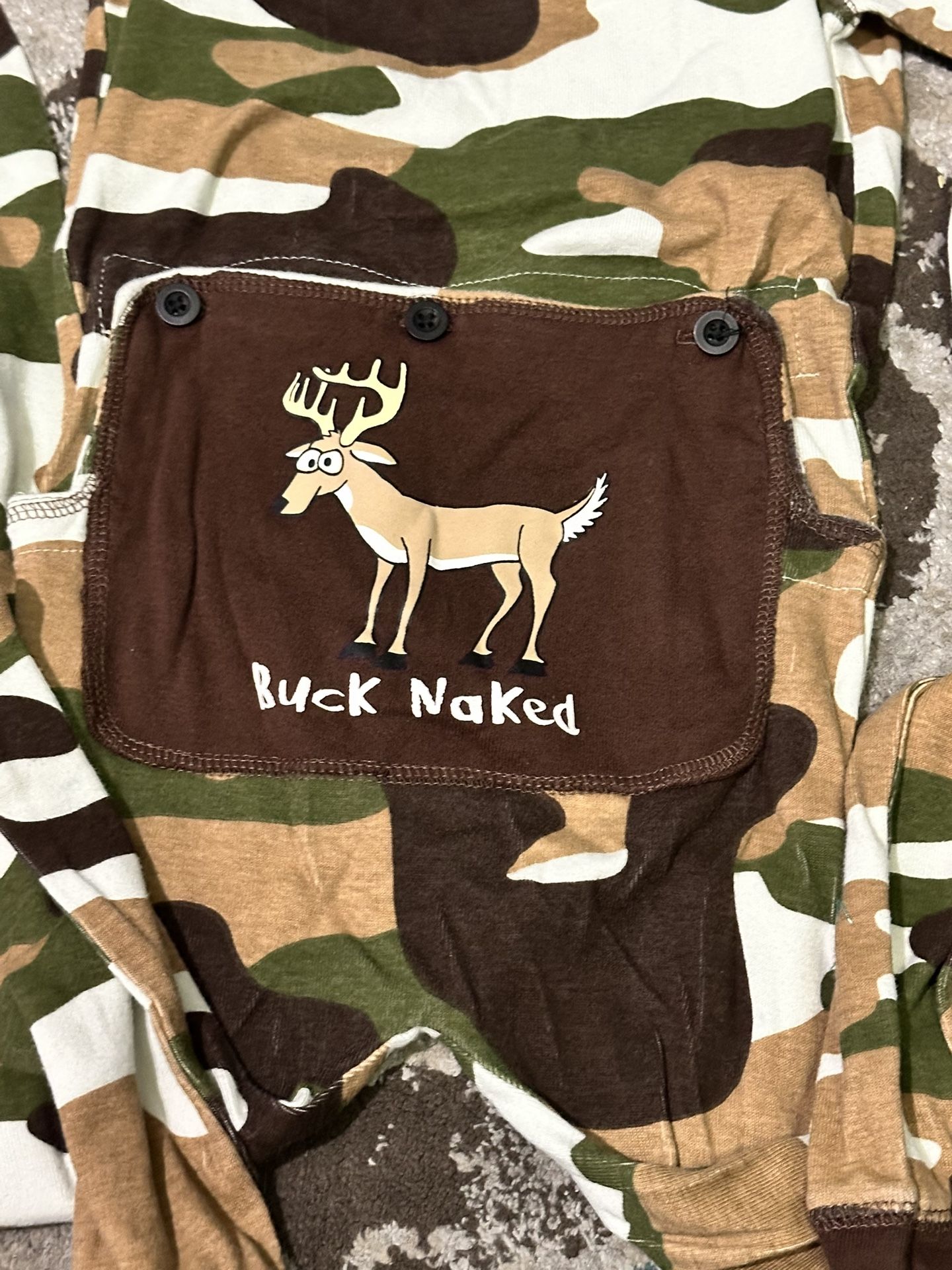 Camo onesie pajamas. These oj’s are sooo cute with a flat on the back side saying ‘buck naked’. The deer is cute! Tan, brown and green colors! Smoke free, pet free home. Worn only once. Meet: Tatum/101