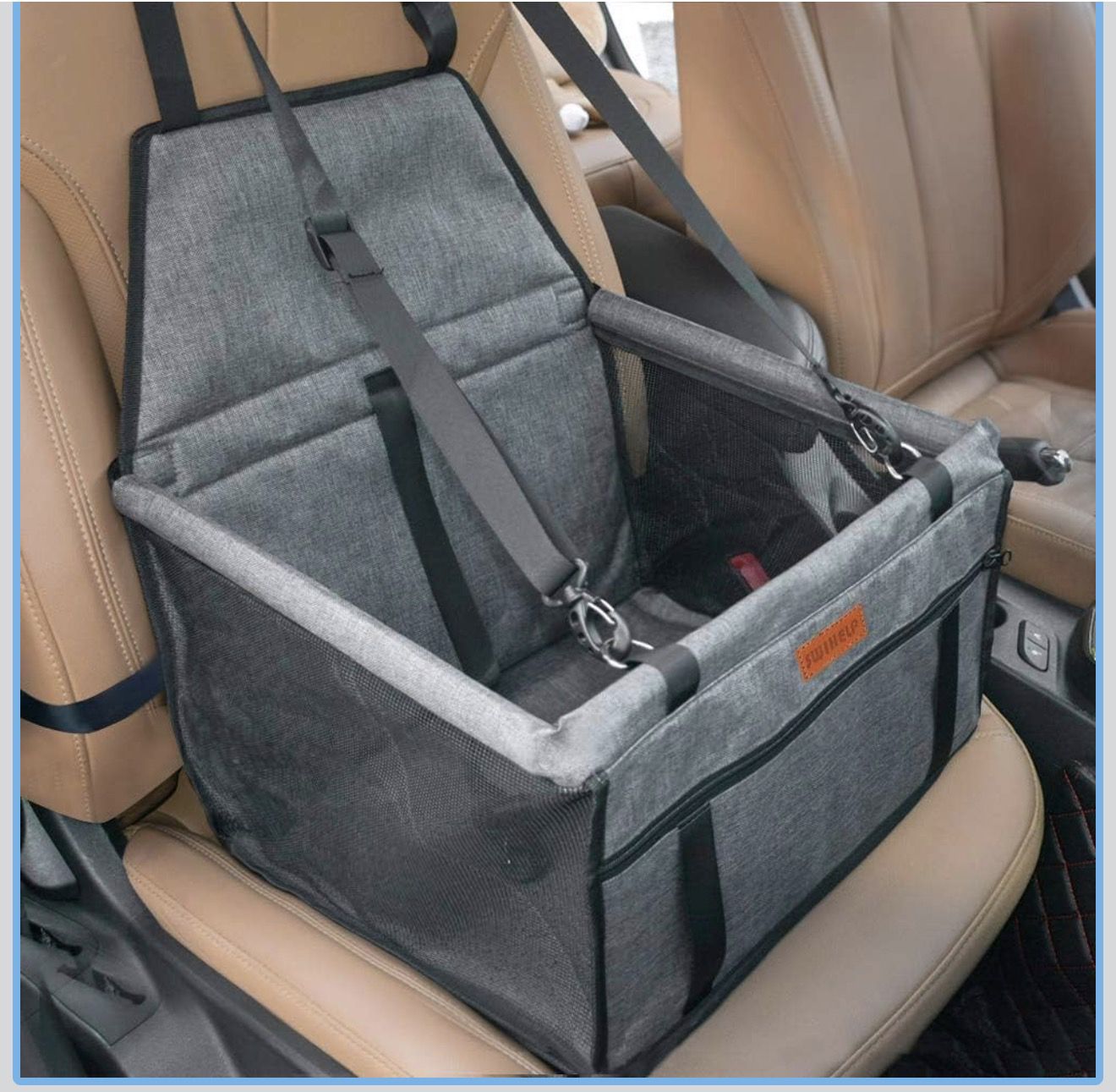 New dog car seat. Grey color with PVC pipe frame for support. Has a clip-on safety leash. Measures about 17.3 inches high, 13.38 inches deep, and 15.75 inches wide. Great for small pets to ride safe and comfy!