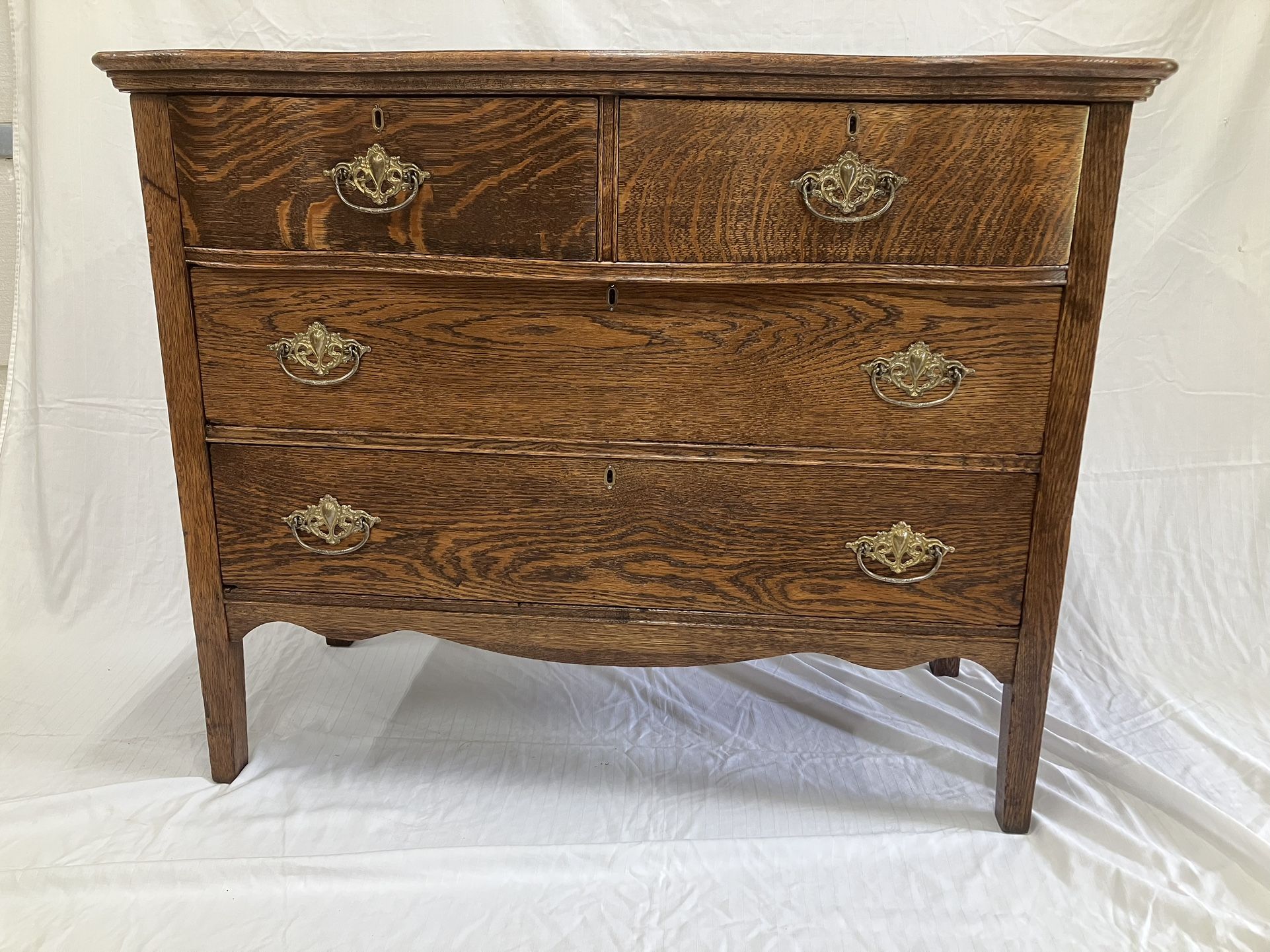 Antique 4-drawer dresser made by a company called The Fair, which was established in 1874. When we acquired this dresser, we were told it had been in the family since the 1890’s. For a dresser that is 135+ years old, it did require repairs to the drawers and the back. However, the frame and the dresser top were in great shape. It has been completely refinished with an English Walnut stain and satin finish and should last another 100+ years! Original hardware. H-34”. W-42”. D-20”