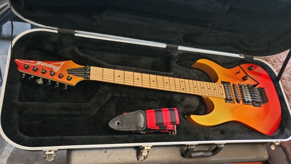 IBANEZ RG SERIES RG470MB 1P-01 MADE IN INDONESIA IN AUTUMN FADE METALLIC COLOR SOLID BODY ELECTRIC GUITAR. guitar is in brand new condition, just taken out of the box, to make a set up and making everything is working good. This beautiful guitar is all professional setup with low action, straight neck, not buzzing frets, also just replaced the 10-47 brand new string. This beautiful guitar sounds amazing and clean also she is really smooth and easy to play. Ibanez RG470MB-AFM in stunning Autumn Fade Metallic finish, this solid body electric guitar is in great condition and perfect for shredders. Features include a fast Wizard III maple neck, a bound maple fretboard with 24 jumbo frets, a meranti body, and Quantum HSH pickups for versatile tones. The Edge-Zero II tremolo bridge ensures excellent tuning stability, making it ideal for an expressive playing. A sharp looking, reliable performer ready to rock. If you have affinity for metal, rock, this is the one for you, but don't get fooled about this guitar, she is very versatile guitar, you can get into any kind of rhythm that you want, so guitar is ready to show up on the stage, guitar is coming with whammy bar and a hard case included, but Strap is not included lol, thanks for looking (NO TRADES, NO SHIPPING SORRY)
