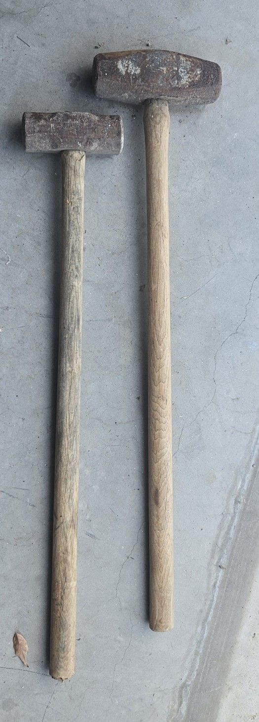Sturdy tools for demolition stuff. Got two sledgehammers here with wood handles. Metal heads have a weathered look and show signs of use. Handles are solid. Selling as a pair. First come first serve.