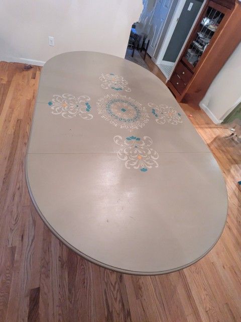 Painted Dining Room Table Thomasville table- 77" x 45" Oval with 2 leaves... Unsure of measurement without leaves Hand painted/chalk paint and sealed Pick up only - heavy wood Small side support legs need to be secured