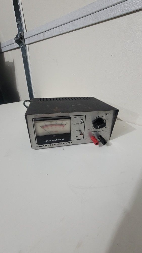 Vintage Micronta Variable DC Power Supply. This unit features an analog meter for displaying Volts and Amps, and a knob for Voltage Adjustment. Manufacturer Specifications: Voltage: 0-16 VDC Current: Continuous Duty Rated 1 Amp Input: 120 VAC, 60 Hz, 30 Watts Max. Condition: Used, as pictured. Comes with attached AC power cord and front-panel DC output terminals (red/black). Perfect for hobbyists and electronics testing.
