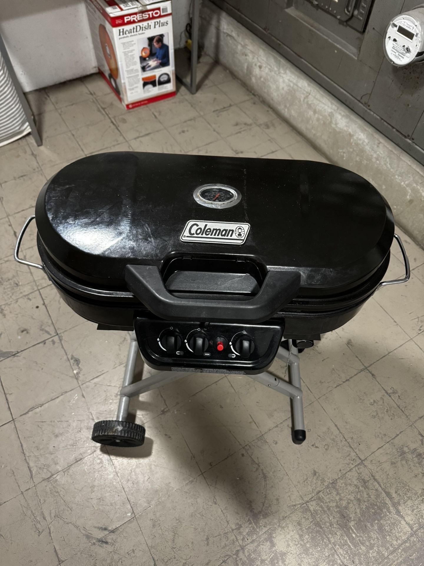 *Please look up product for specifications!!!* Portable--rolls around. Cover comes with. Can be connected to large propane tank but you'd need to buy the connector. otherwise it uses standard green-can Coleman propane--screws right on. this thing has been sitting in my storage for a long time. It needs an intense cleaning but has always worked great. Rust shown is surface and minor--bbq still has a LOT of life left in it. I need it gone for the extra space. i'm letting it go for $100 AS IS. Elbow grease required. Brand new you'll be hard pressed to find one for below $250. Plus you get the cover. Must be picked up