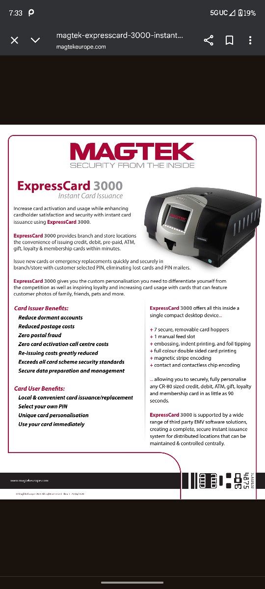 Instant Issuance Card Printer, Encoder and Embosser!!!! ✅7 secure, removable card hoppers ☑️1 manual feed slot ✅Embossing, indent printing, and foil tipping ☑️Full colour double sided card printing ✅Magnetic stripe encoding ☑️Contact and contactless chip encoding ... allowing you to securely, fully personalise any CR-80 sized credit, debit, ATM, gift, loyalty and membership card in as little as 90 seconds. ExpressCard 3000 is supported by a wide range of third party EMV software solutions, creating a complete, secure instant issuance system for distributed locations that can be maintained & controlled centrally. 7 Card hoppers and manual card feed The ExpressCard 3000 comes with seven card stock hoppers (each with a capacity of 100 cards). It also has a manual feed slot, output hopper, and secure card rejection bin, giving you the ability to manage inventory easier.
