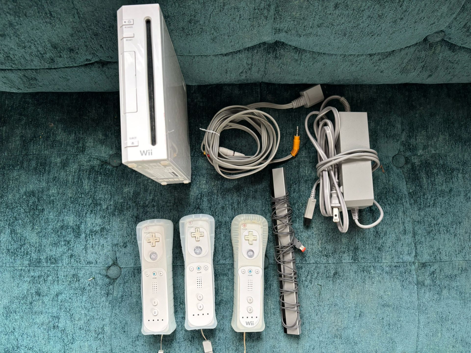 Wii console, (3) controllers, balance board for Wii fit, Mario kart and (2) wheels, (9) games. Priced as bundle but will consider separate offers.