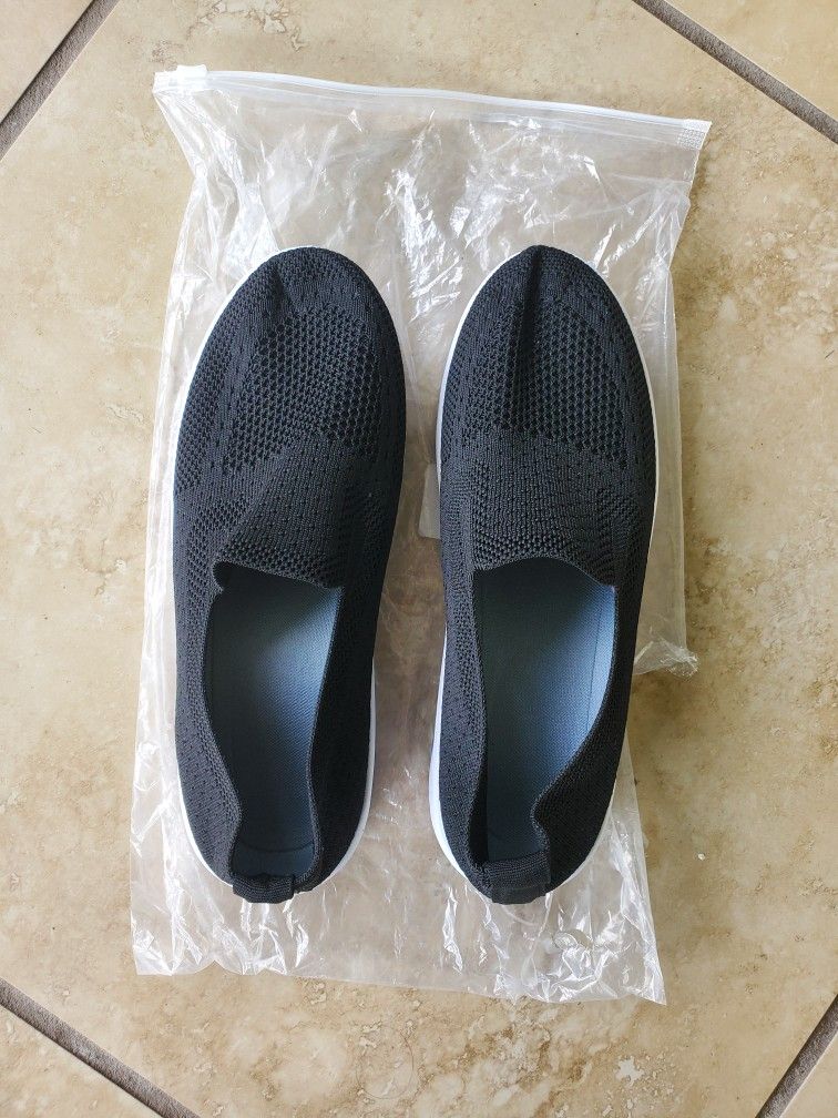 NEW WOMAN'S BLACK FASHION SLIP ON SNEAKERS 7.5 EQUAL TO 38 EU. BOUGHT WRONG SIZE. BREATHABLE LINED MATERIAL. MEMORY FOAM INSIDE.