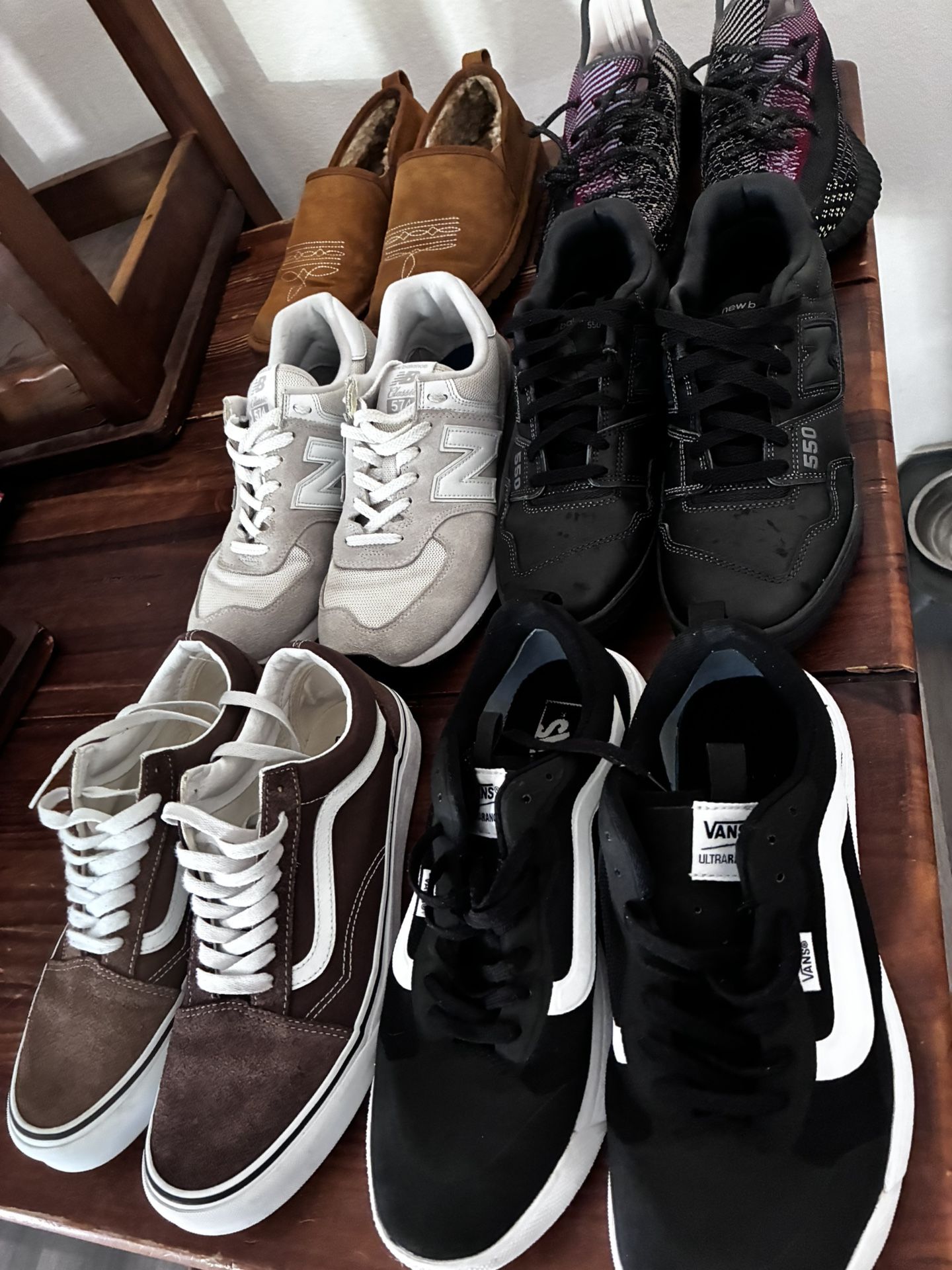 Vans Brown Brand new -$50 Vans athletic black/white -$60 New balance Black Brand new -$60 NB White athletic - $50 Ariat Winter Slippers New -$40 YEEZY 350 “Yecheil”-$120 All size 9.5 except Vans Brown/ Ariat
