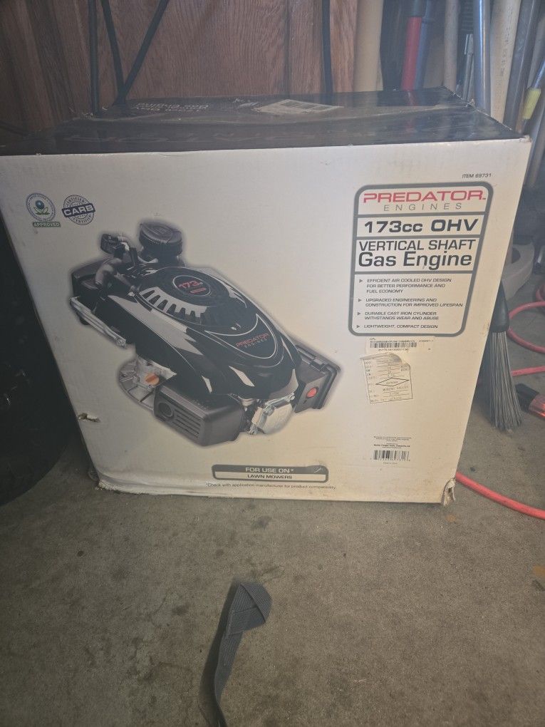 New In The Box 6.5 hp 173cc Gasoline Vertical Shaft Engine by Predator direct replacement for 99% of all 19 to 22 inch lawn mowers out there. Out the door retail Price $270 comes with new 21 inch mower blade and mounting adapter another $50 value.