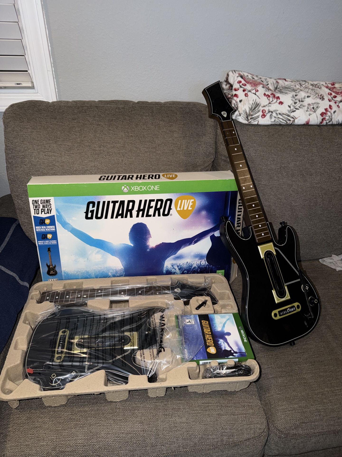 I have a super dope guitar hero live bundle for the Xbox one. This set is actually brand new. Everything is still in its original packaging and the guitar still has the whammy bar seal meaning is hasn’t used or open. I’m including a extra guitar incase you didn’t want to use the new one and have it saved as is. This bundle only comes with ONE DONGLE meaning only one guitar will be able to connect. You’ll need another dongle if you wanna be able to connect both guitars but this is an amizng gift set and game! Play as the guitarist POV as concerts! One hell of game! Will be shipped out asap OBO