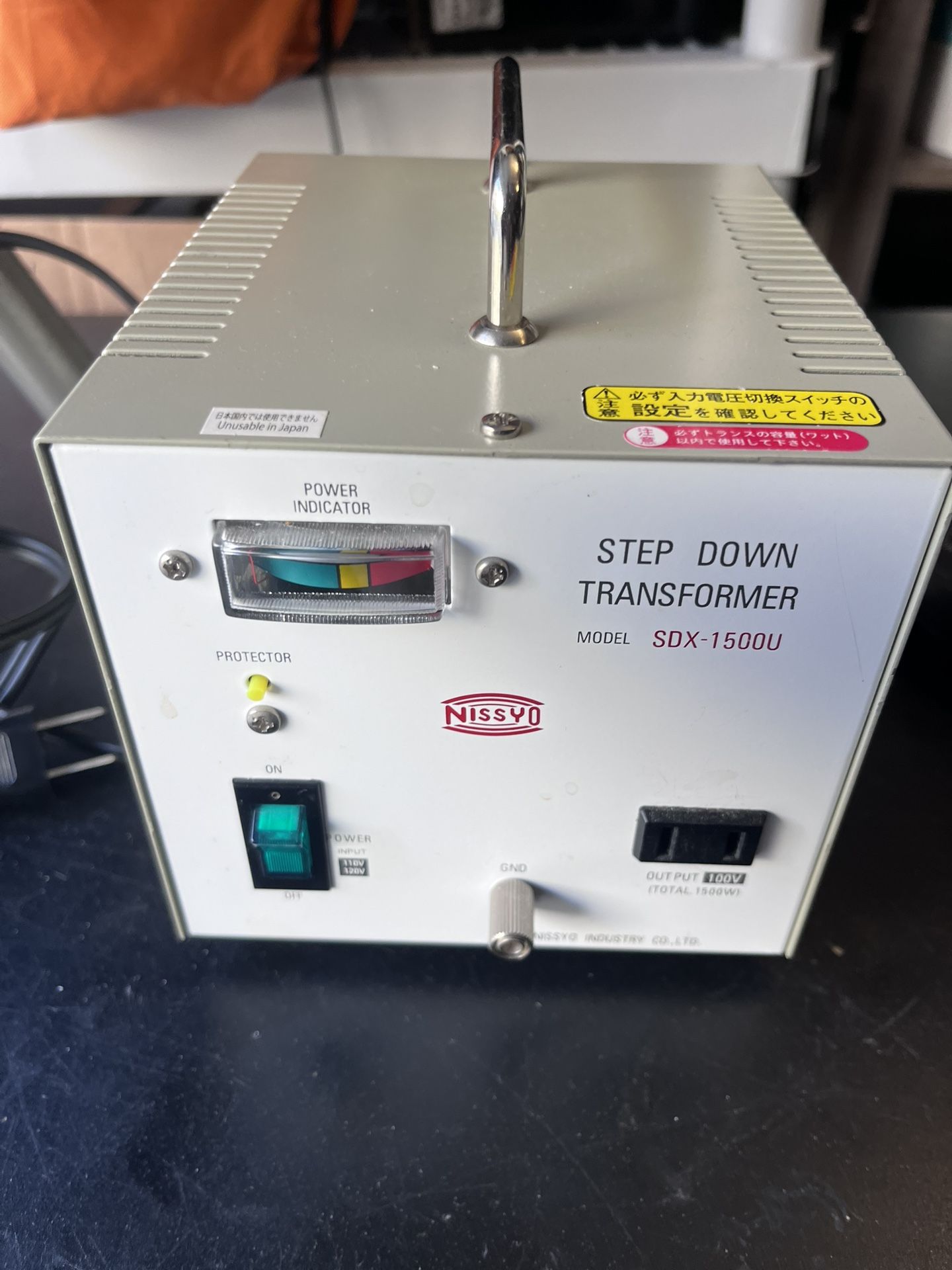 High-quality Nissyo SDX-1500U step down transformer. Perfect for running Japanese 100V electronics safely in the US. Price: $80 Details: - 1500W capacity - Converts 110-120V → 100V - Made in Japan (high quality) - Power indicator + protection switch - Heavy-duty build with carry handle Condition: Tested and working. Very clean. Great for: - Japanese appliances - Audio equipment - Specialty electronics Pickup only.