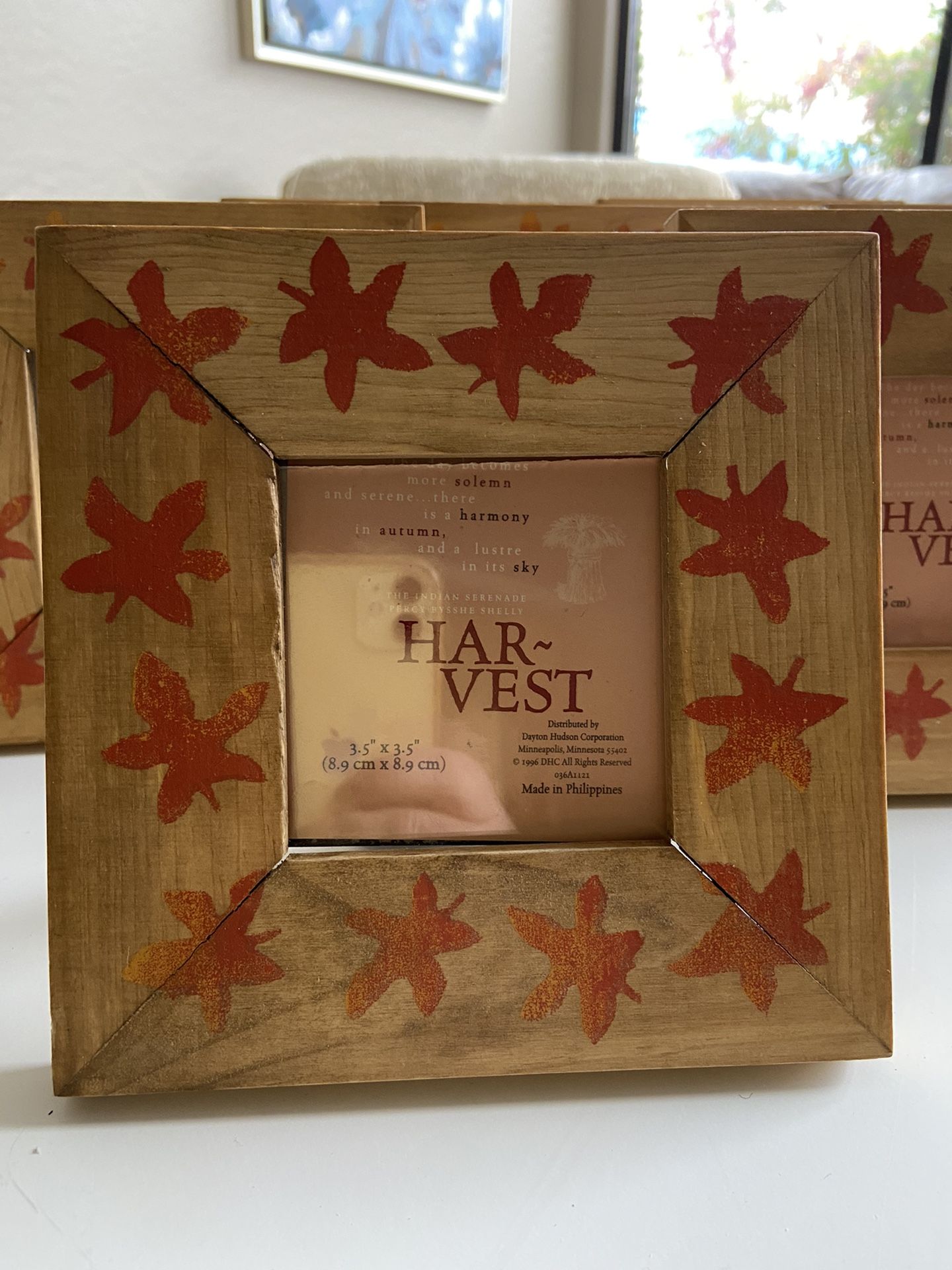 I have 8 total of these super cute fall wooden frames. They are 5 x 5 in size and fit a picture sized 3.5 x 3.5. Decorated with bright orange leaves π around the frame. Was originally bought for a fall wedding and never used. Retail price $10 each selling individually at $4 or all for $25!! Could be used for Halloween pictures of the kids or great fall themed gift