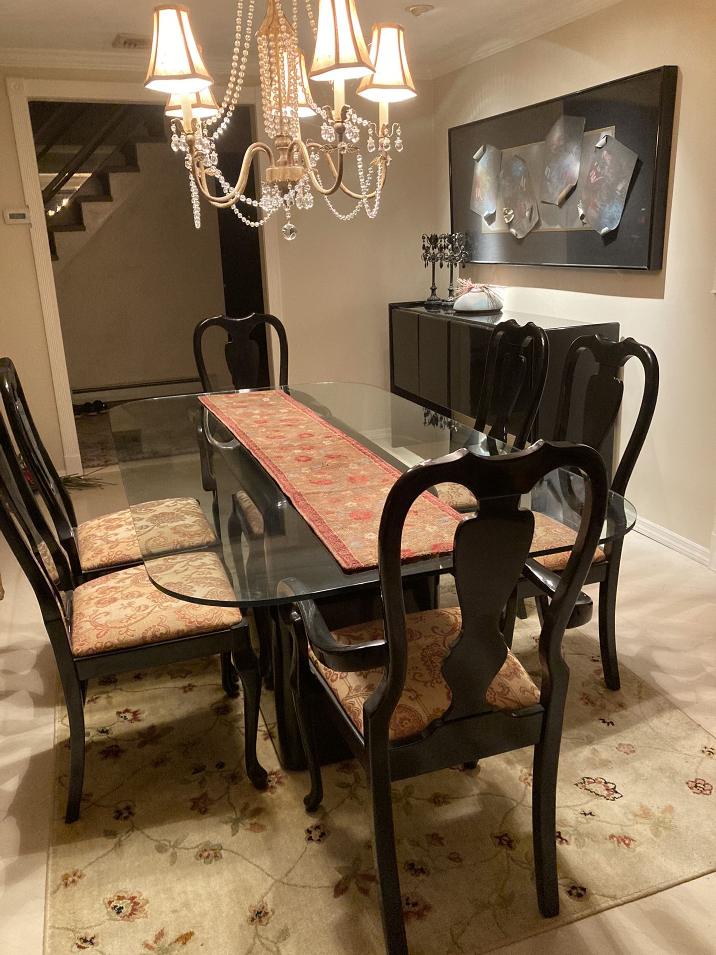Black lacquer base glass top. Six chairs 42x78. Buffet black lacquer 66 L x 36 H