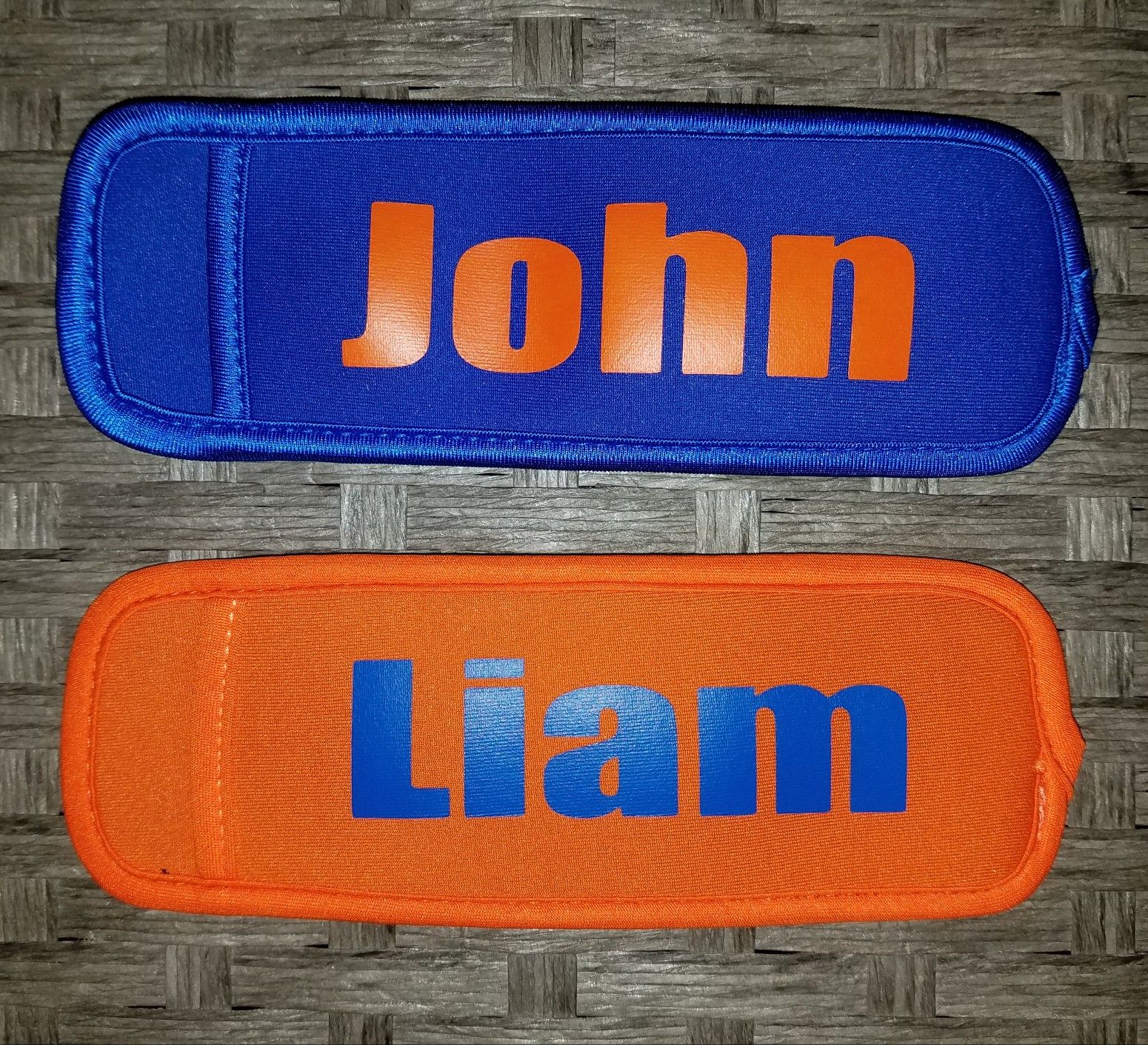 Personalized popsicle koozies. Your choice of the following colors: orange, red, yellow, light pink, turquoise blue, purple, fuchsia, and gray.